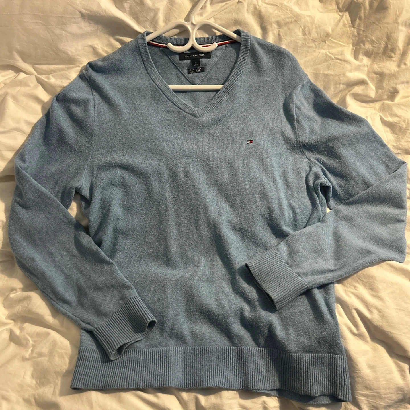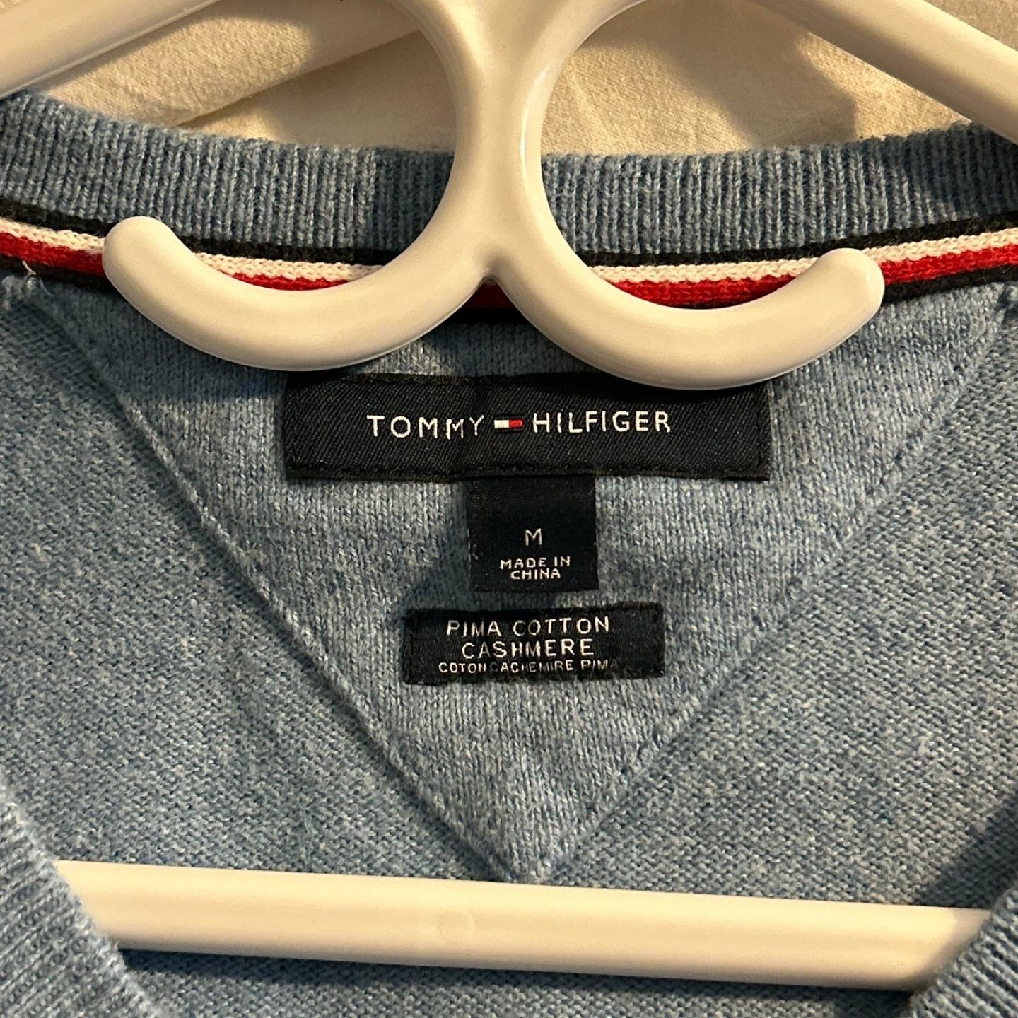 Tommy Hilfiger V-neck sweater in a light blue colour. It's made from Pima Cotton Cashmere blend. Size medium.
