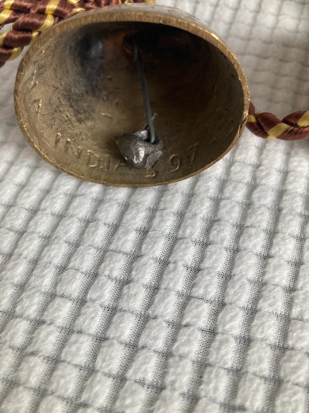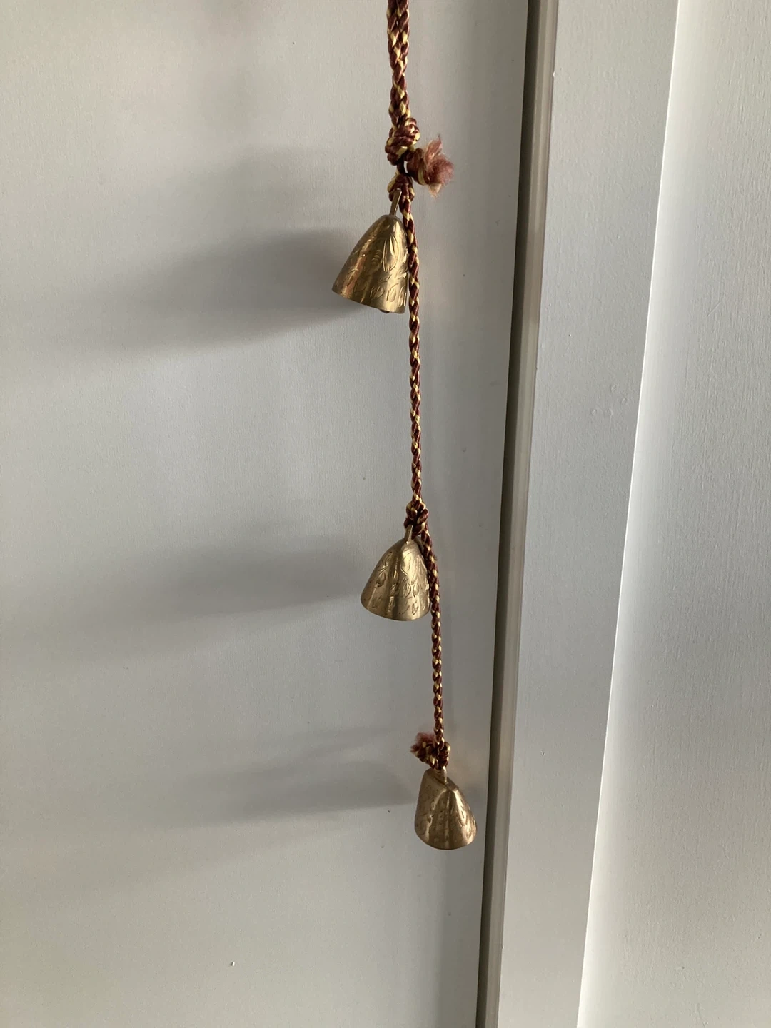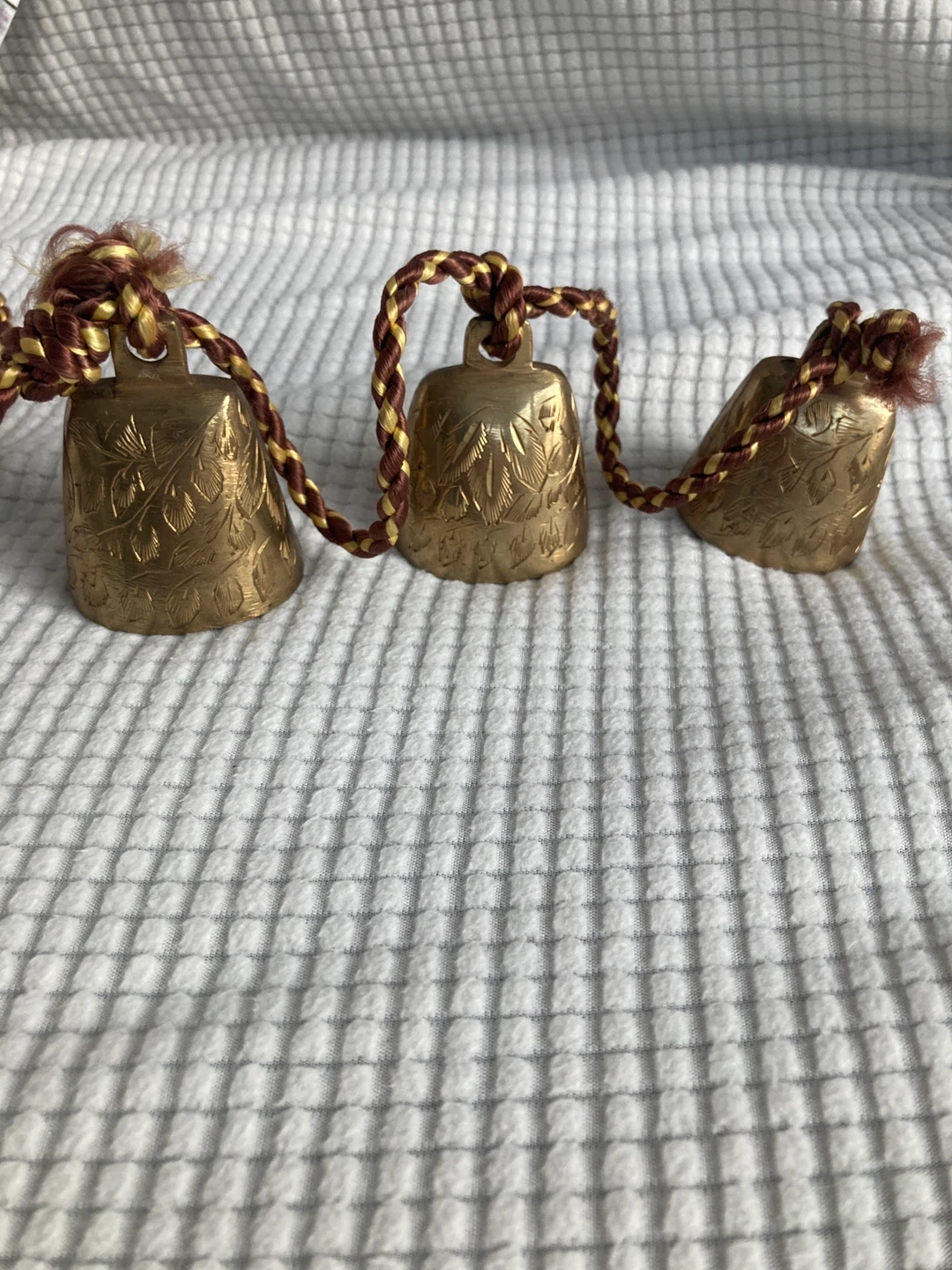 Decorative brass bells strung on a braided rope with tassels. Each bell features intricate embossed floral patterns. They're made of brass and sound lovely when gently moved.
