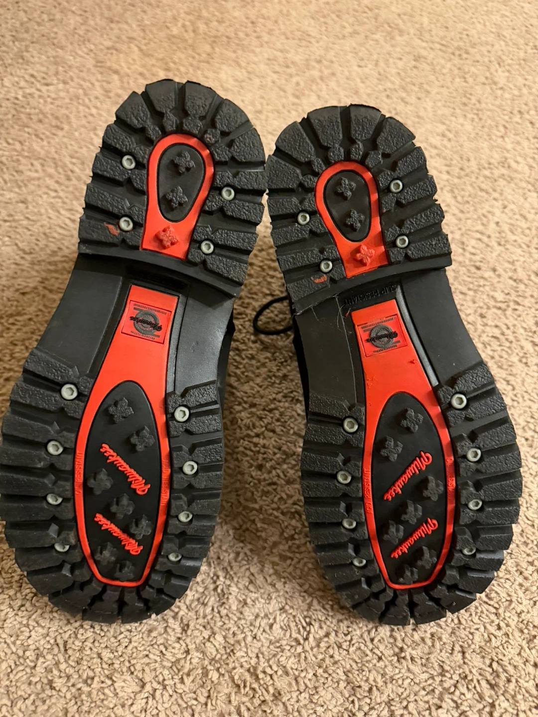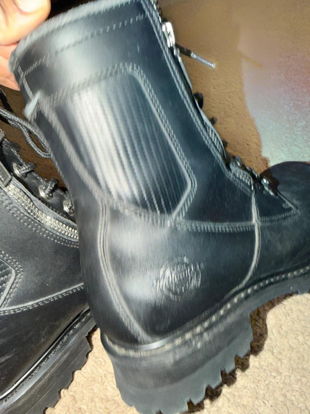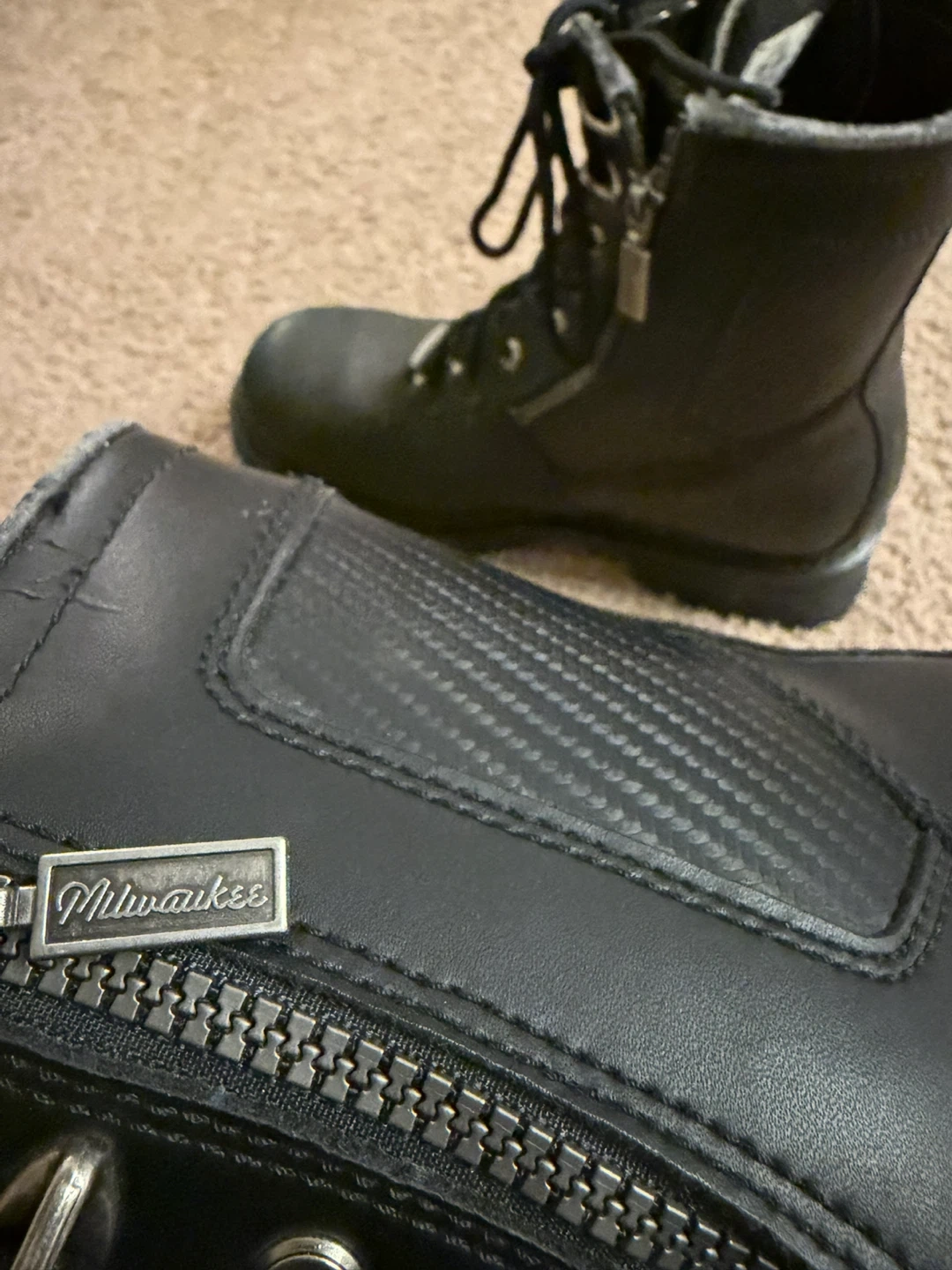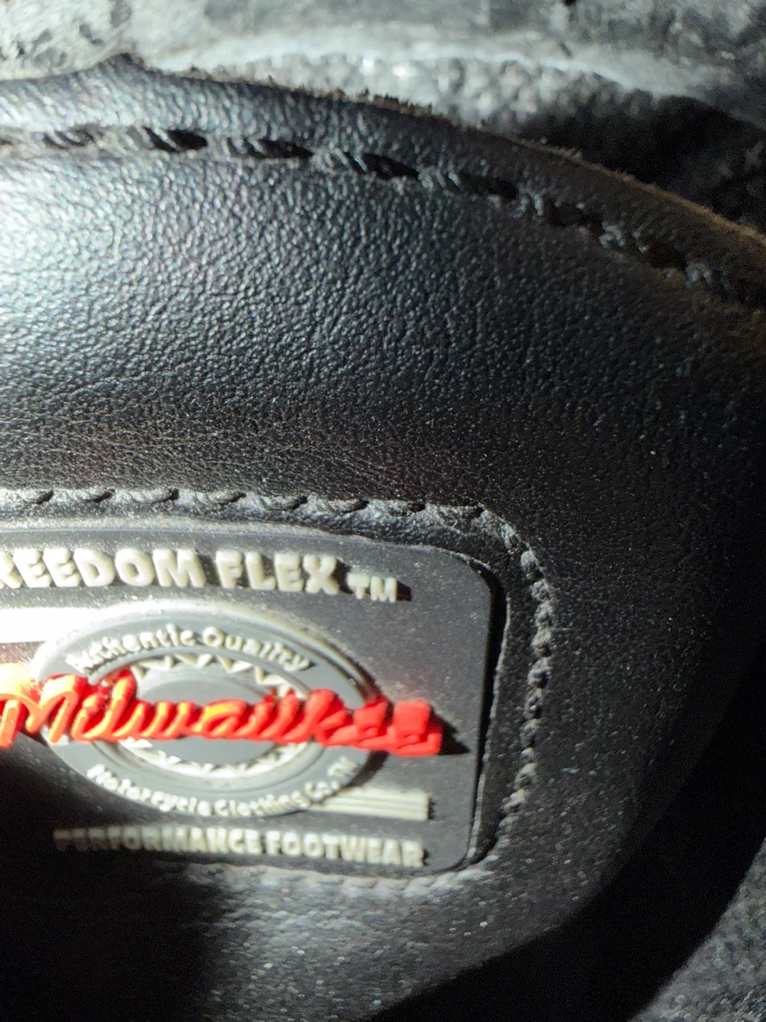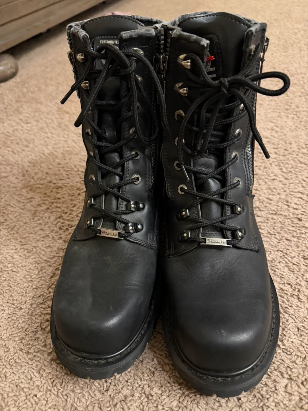 Milwaukee Performance Footwear motorcycle boots. Black leather construction with side zippers and laces. Features 'Freedom Flex' and 'Authentic Quality' branding. Oil and slip-resistant sole.