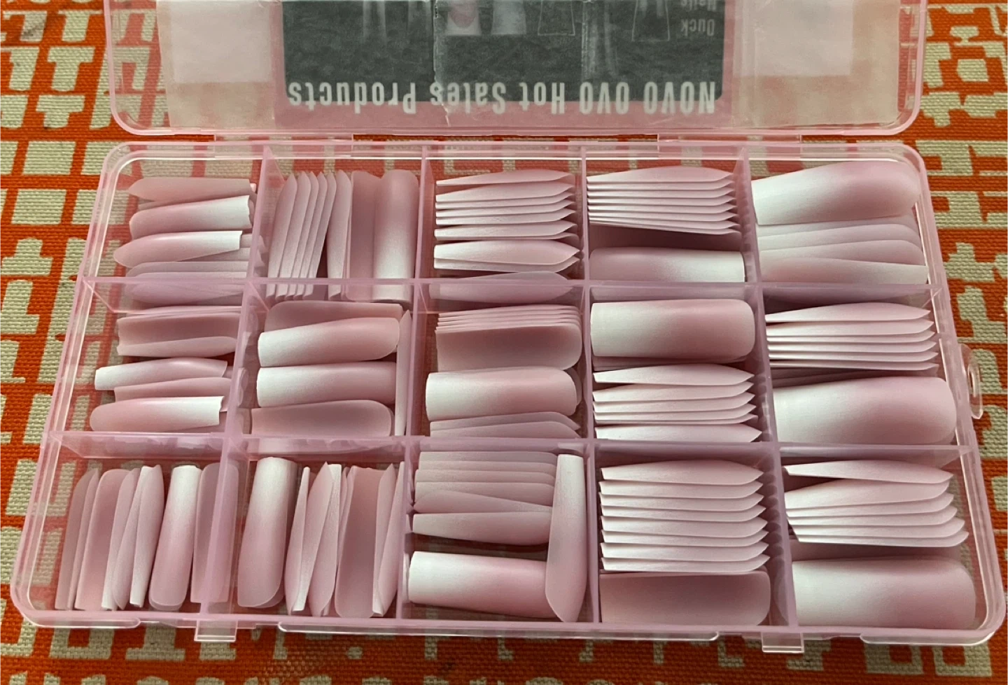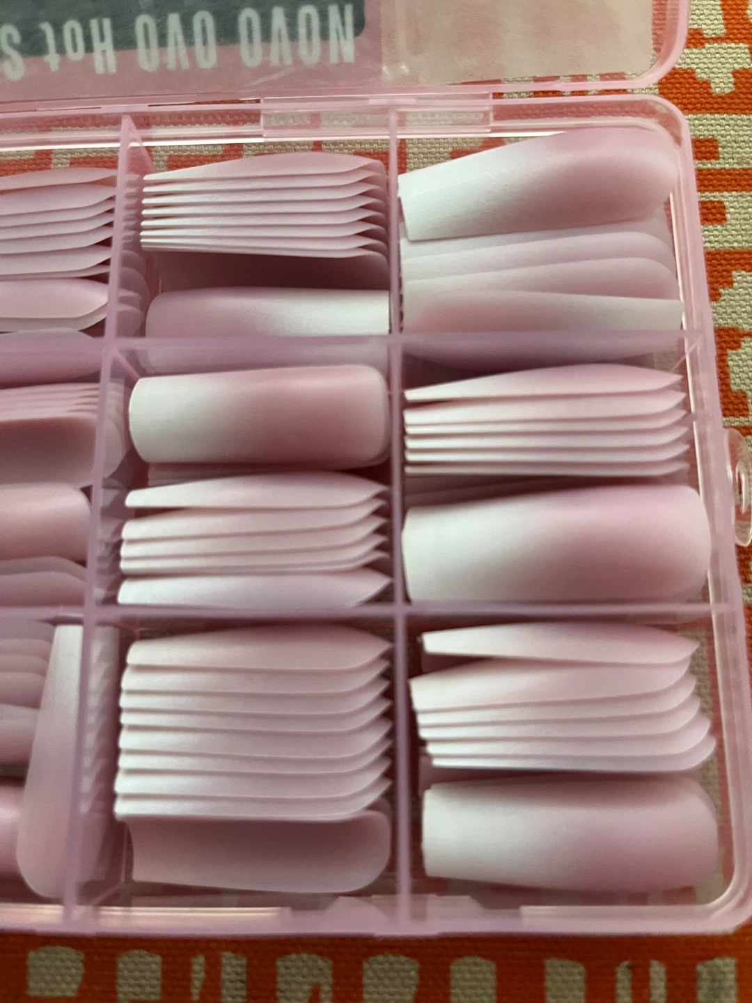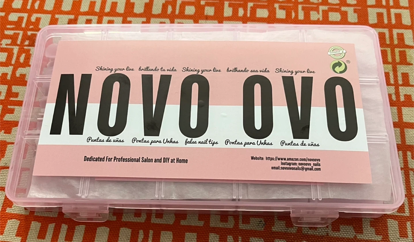 This is a kit of false nail tips by NOVO OVO. It includes various shapes and sizes for professional salon and DIY use. The tips are a soft pink colour with a gradient white tip.