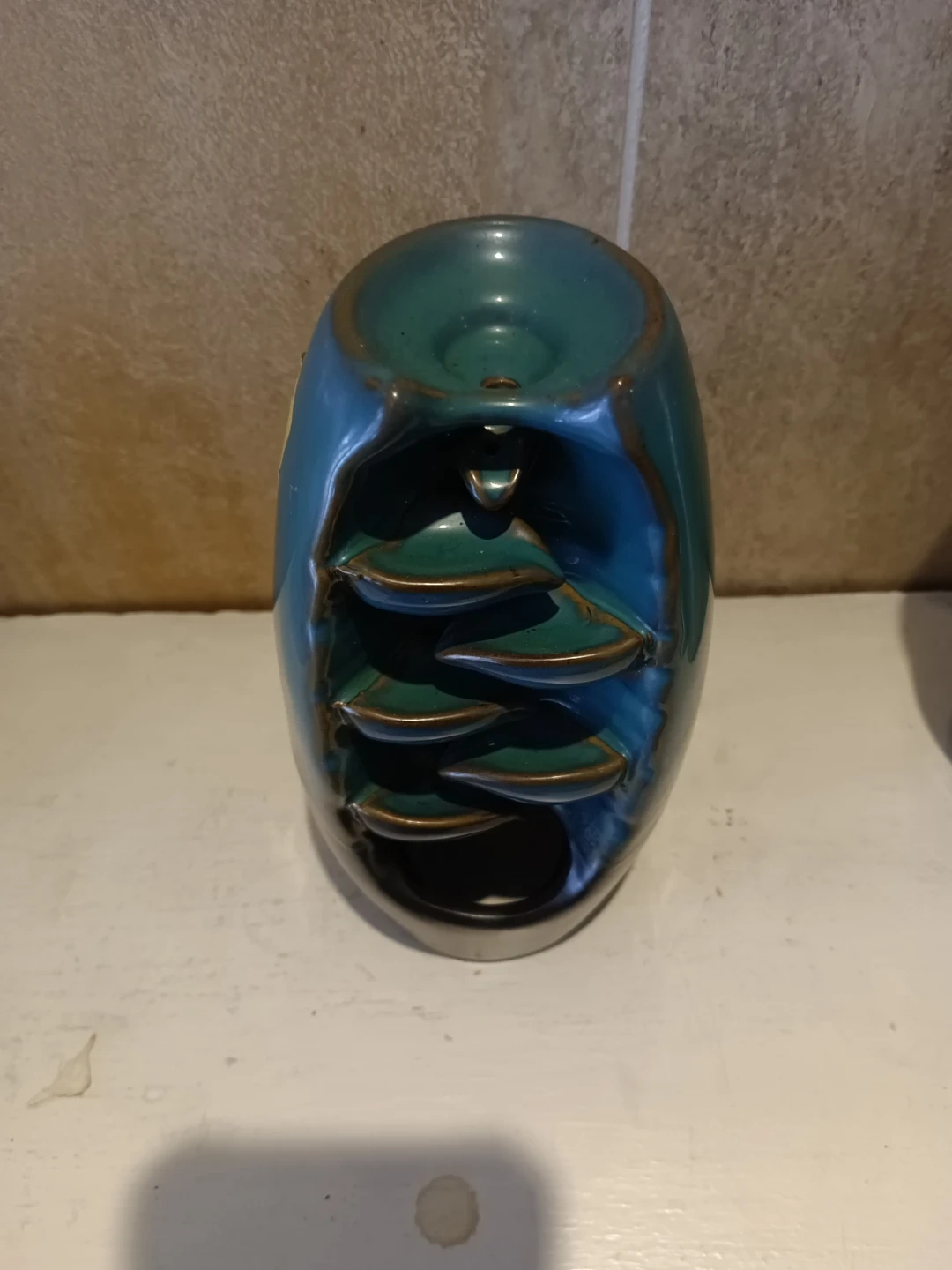 This ceramic incense burner features a unique waterfall design. It's glazed in a beautiful teal and blue finish with gold accents. The design creates a calming visual effect when incense smoke cascades down. Great for creating a tranquil atmosphere in your home!