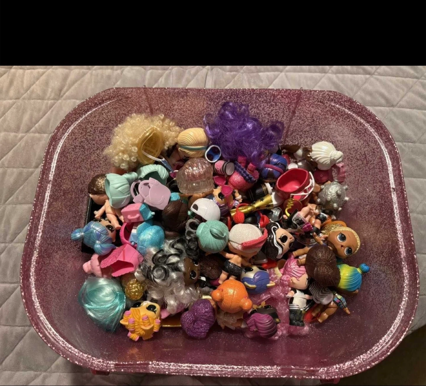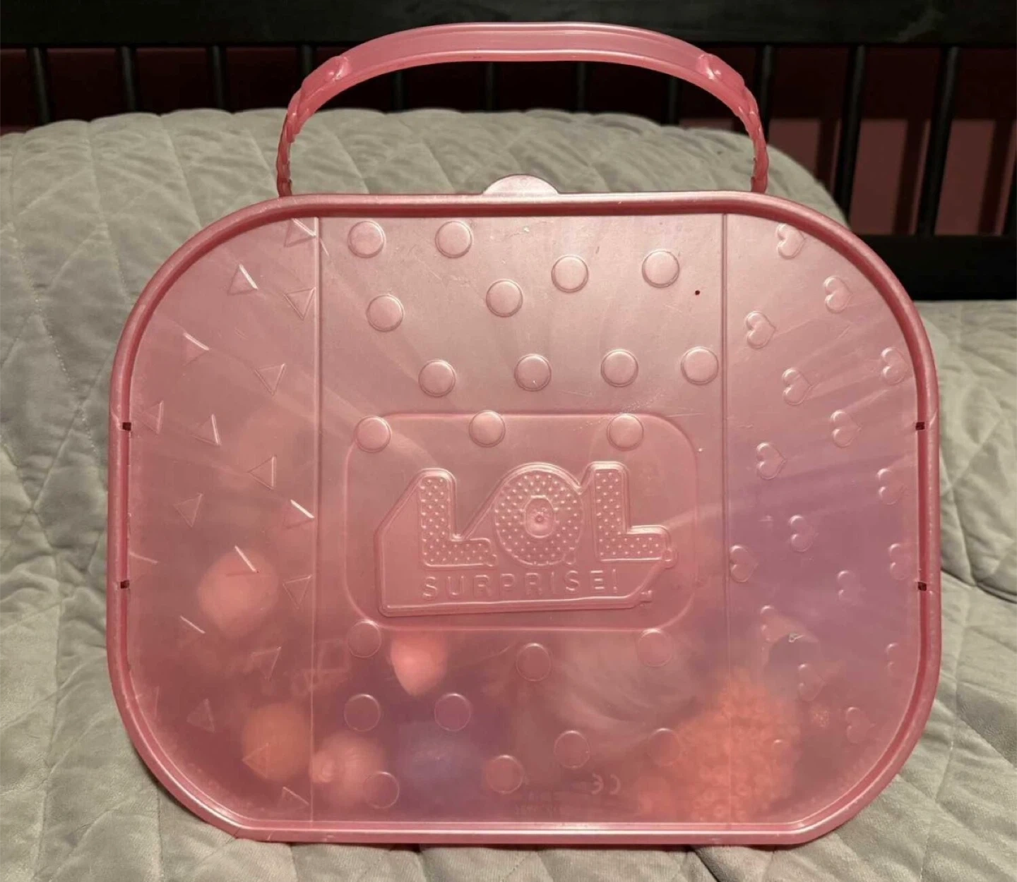 This is a large collection of LOL Surprise! dolls and accessories, all housed in a pink sparkly carrying case. The case features the LOL Surprise! logo embossed on the lid. It's full of various dolls with different hairstyles and outfits. Perfect for imaginative play and expanding a LOL Surprise! collection!