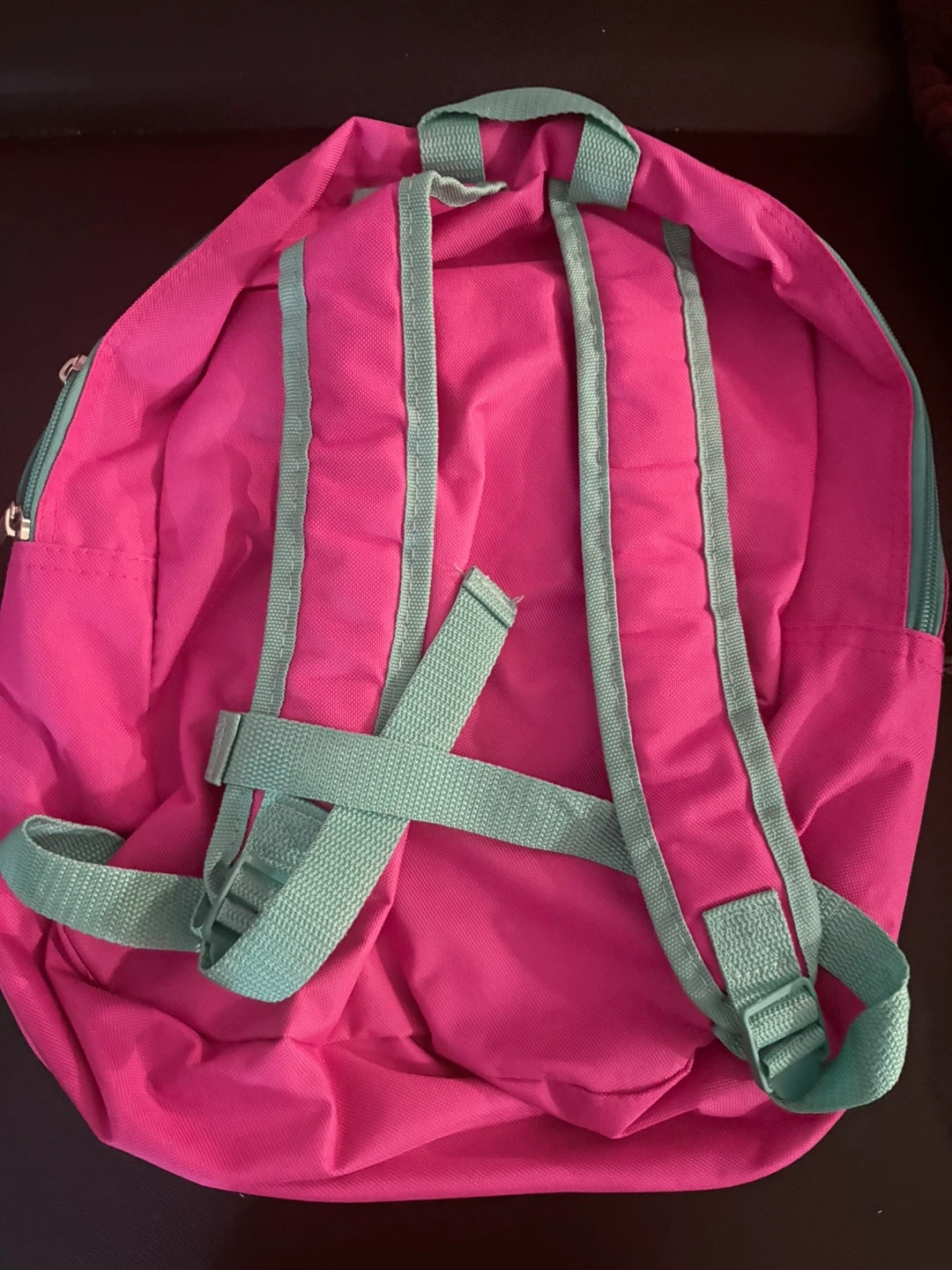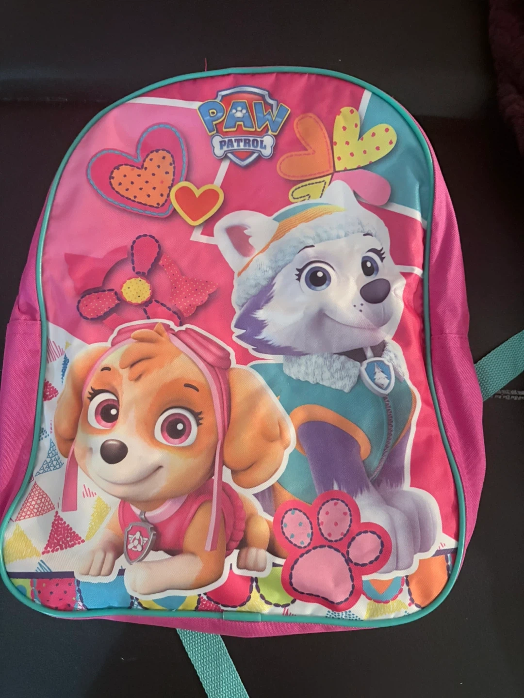 Pink backpack featuring Skye and Everest from Paw Patrol. It has adjustable teal shoulder straps and a teal zipper closure. Durable material for everyday use.