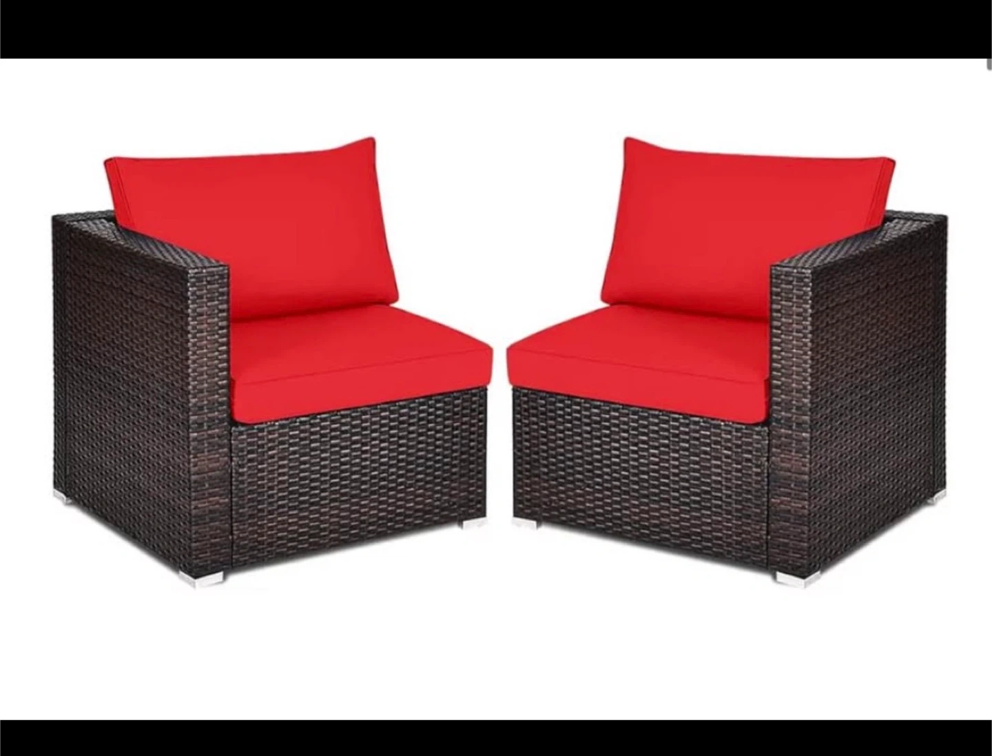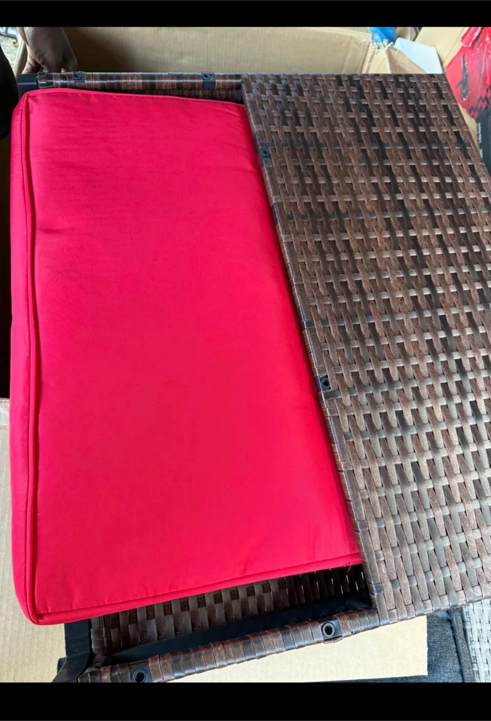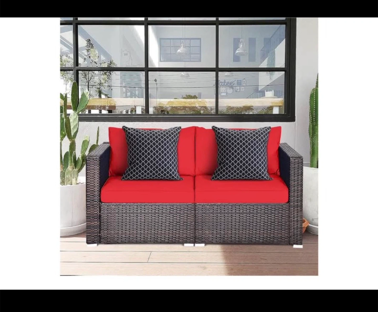 Outdoor wicker sofa set with bright red cushions. Includes two corner chairs with seating cushions and back pillows. Great for patio or balcony use! Not assembled, in box still and brand new. Pick up Welland.