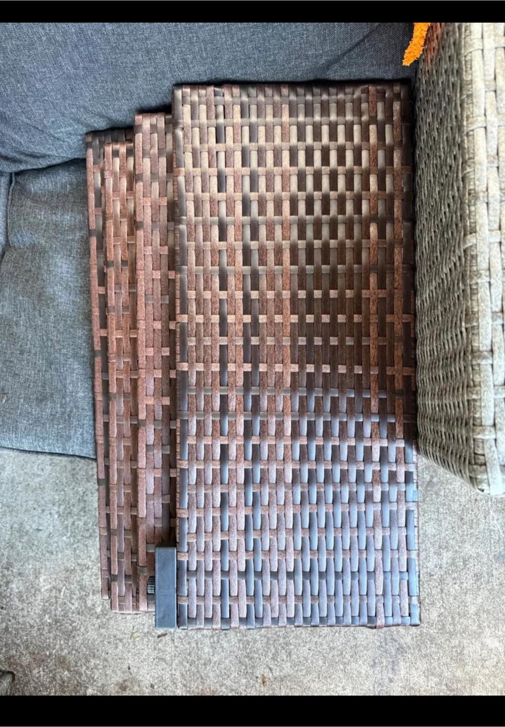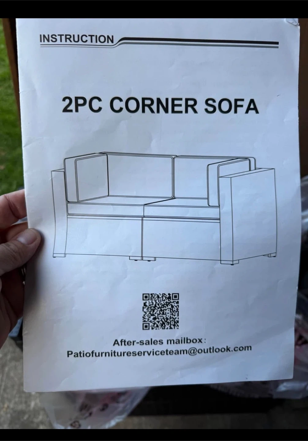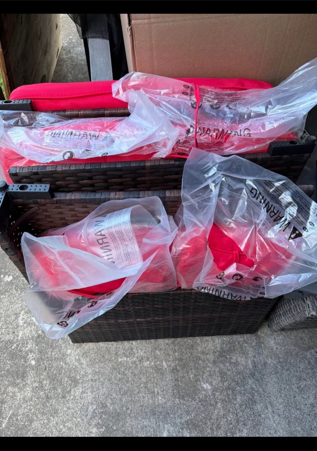 Outdoor wicker sofa set with bright red cushions. Includes two corner chairs with seating cushions and back pillows. Great for patio or balcony use! Not assembled, in box still and brand new. Pick up Welland.