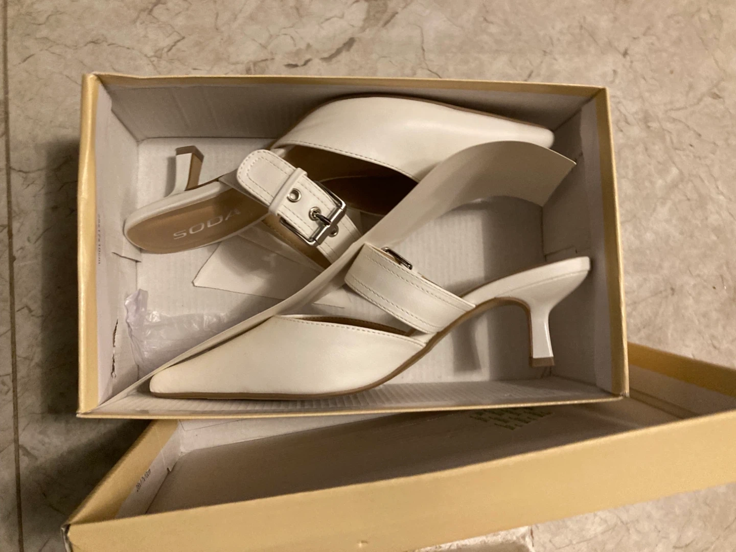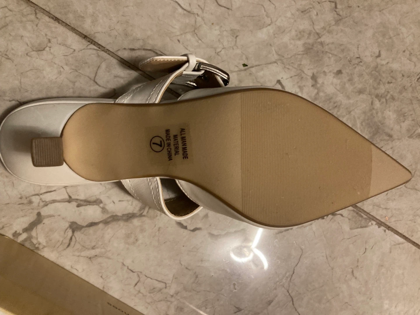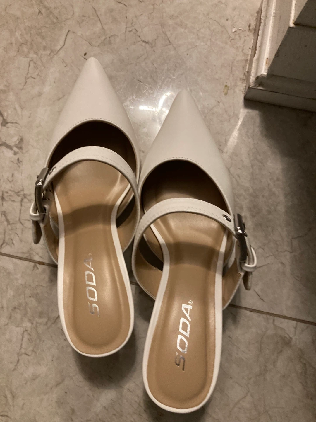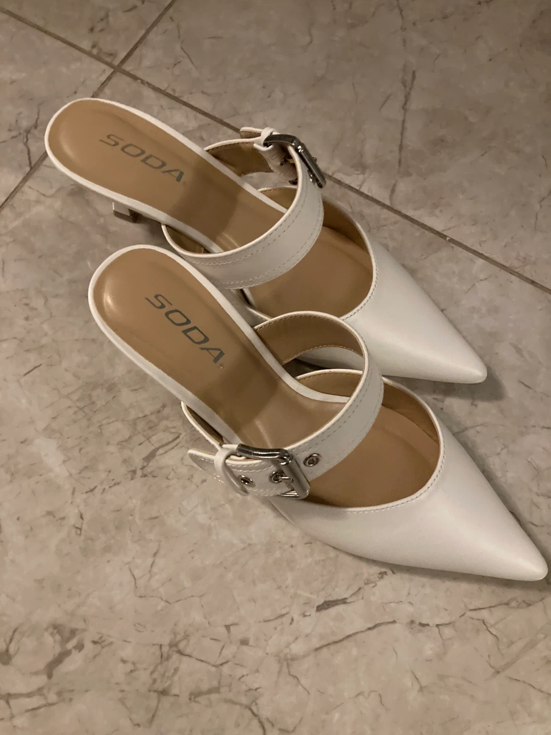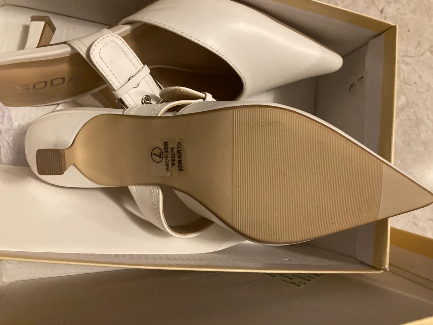 These white Soda mules feature a stylish pointed toe and a buckle strap detail. The all man-made material offers durability. Size is 7. Only wear once inside the building area has no sign of use, selling coz it is not my style. Who ever likes it can contact.