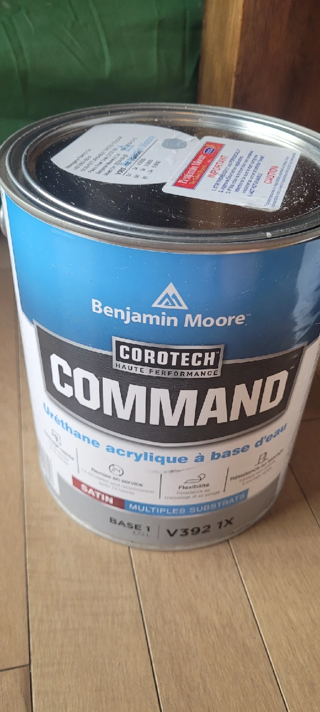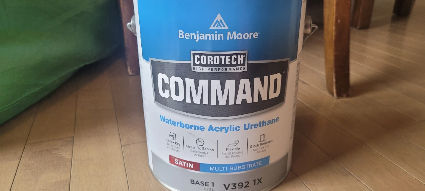 Selling a can of Benjamin Moore Corotech High Performance Command Waterborne Acrylic Urethane paint. The color is Pike's Peak Gray (2127-50) and it's in a satin finish. It's a multi-substrate paint, perfect for various projects.