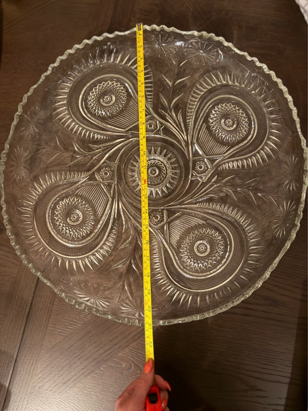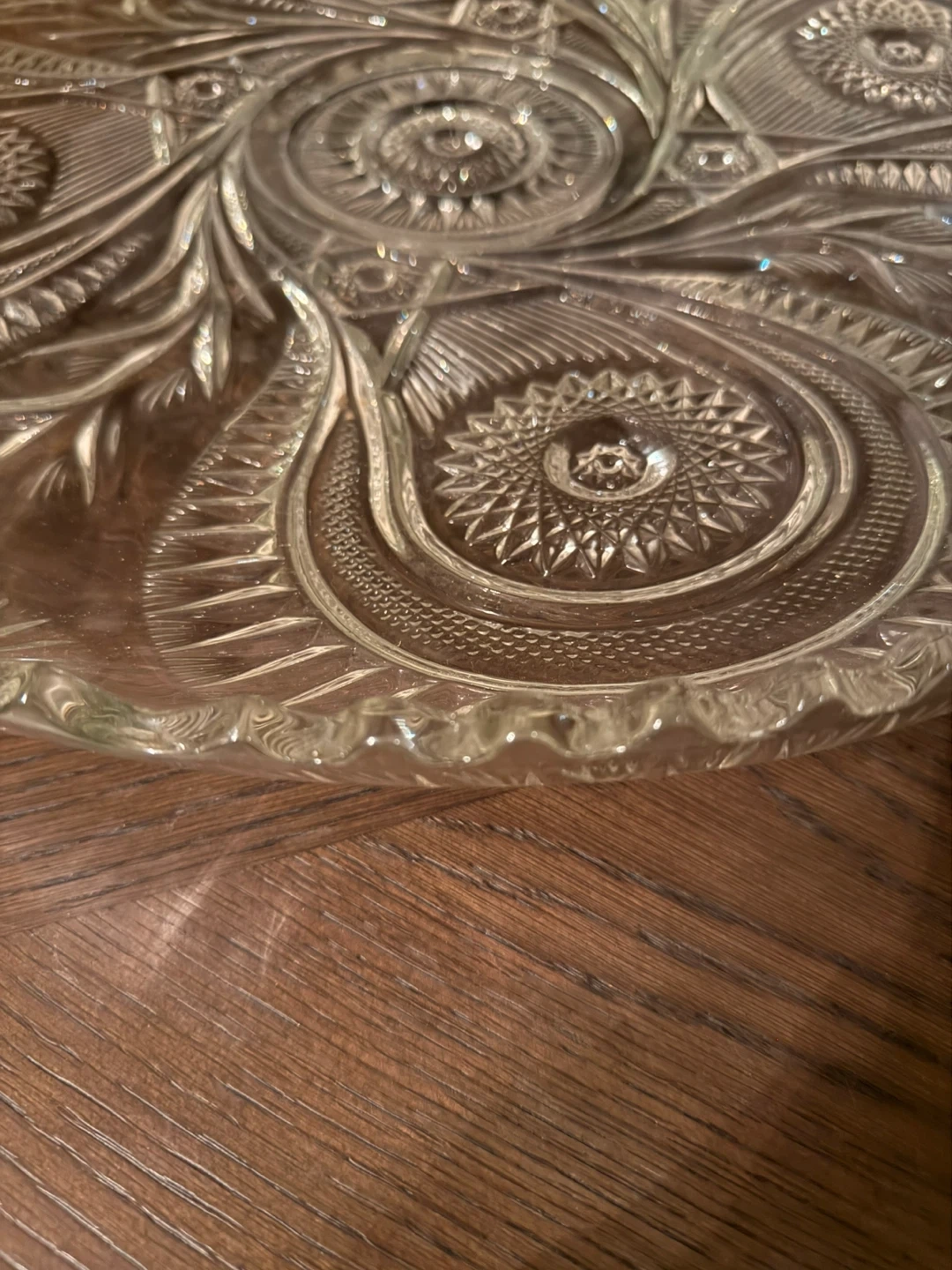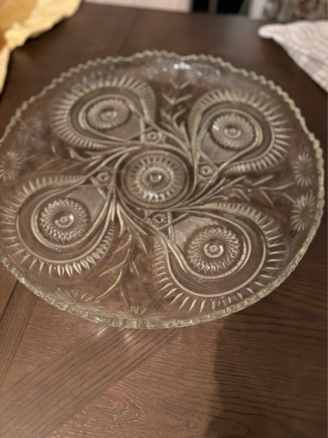 This is a clear glass cake stand or dessert plate. It has an ornate, embossed floral and swirl pattern throughout. The edges are scalloped and detailed. Measures approximately 13 inches in diameter.