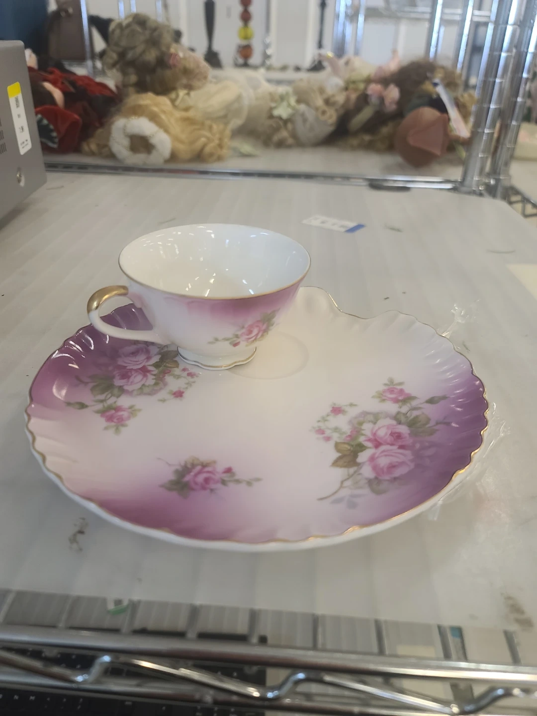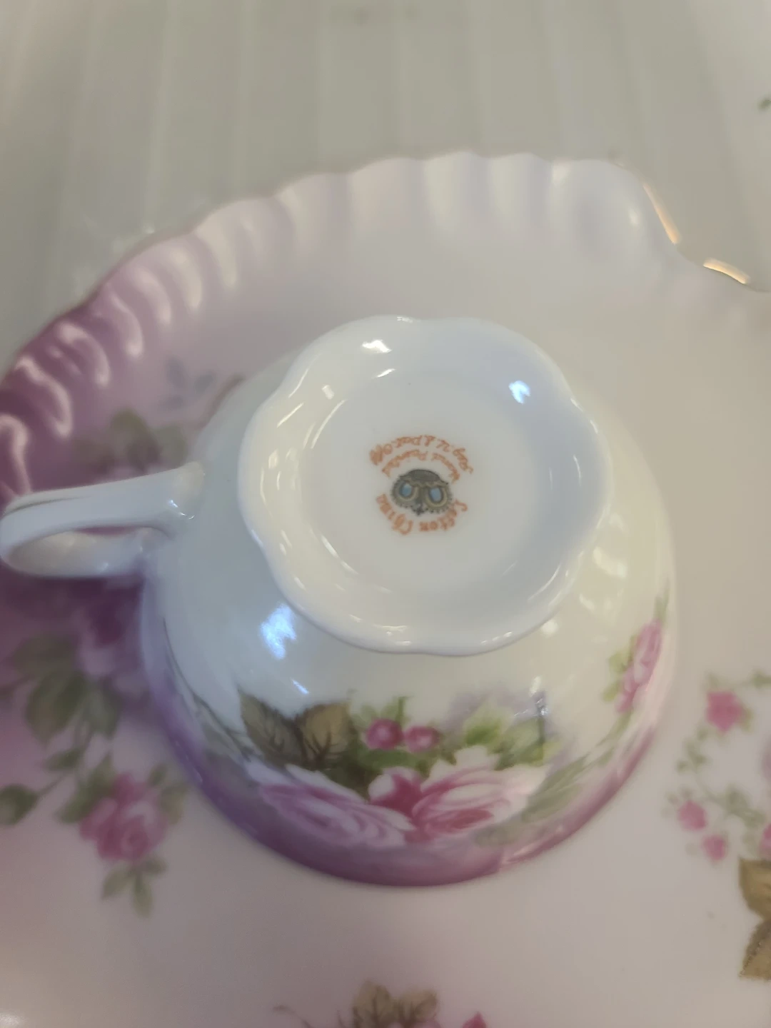 This is a lovely hand-painted tea cup and saucer set featuring delicate lefton china snack set pink roses. The set has a beautiful scalloped edge with a gradient purple and pink design. It's perfect for enjoying a relaxing cup of tea!