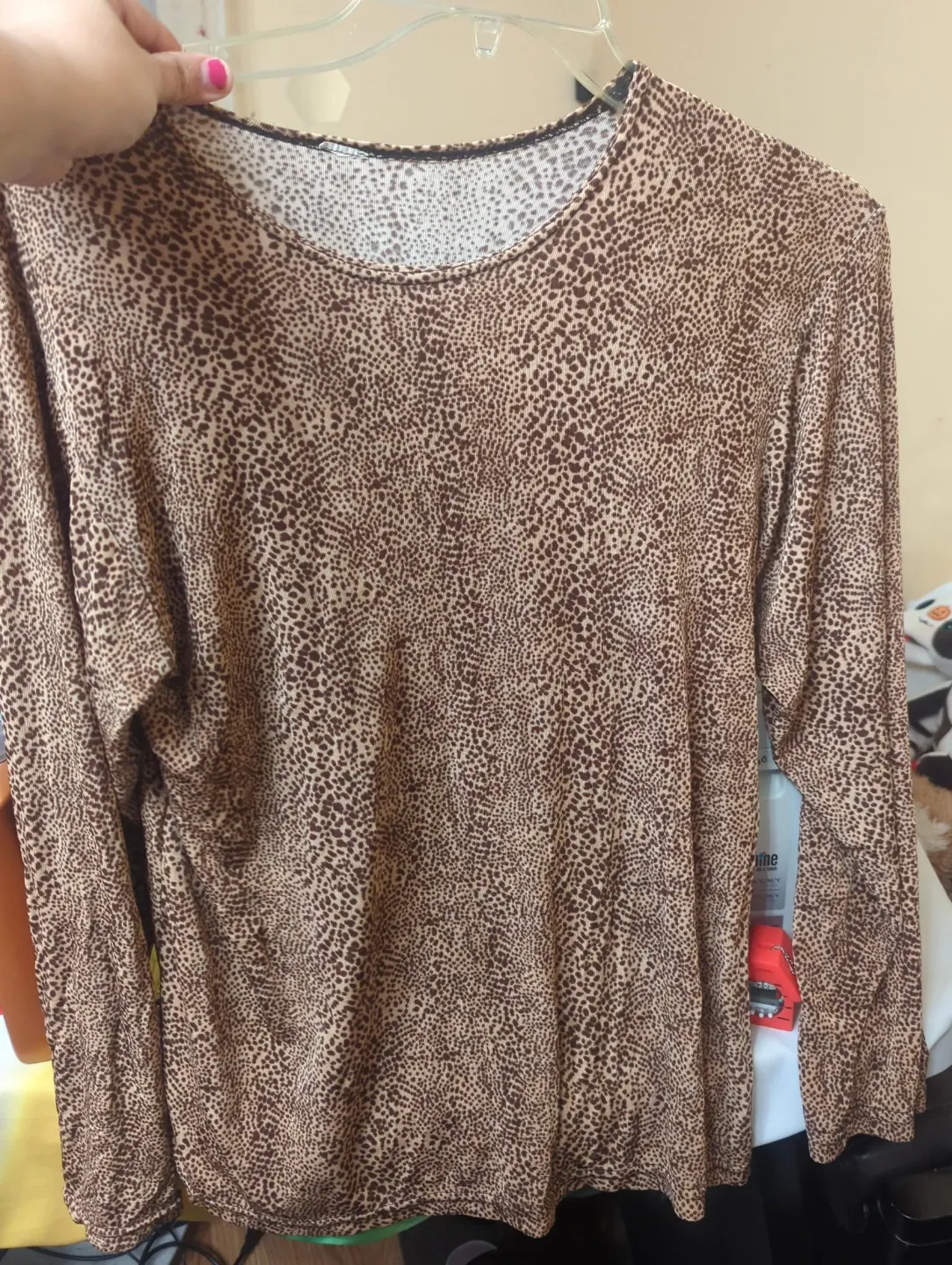A comfortable long sleeve top with a brown leopard print pattern. It's made of a soft, stretchy material. Crew neckline.