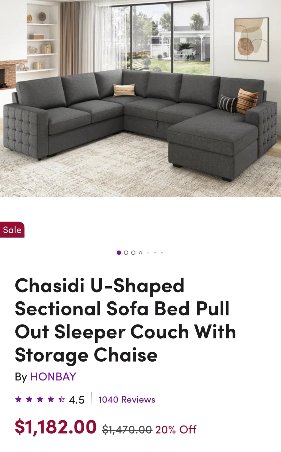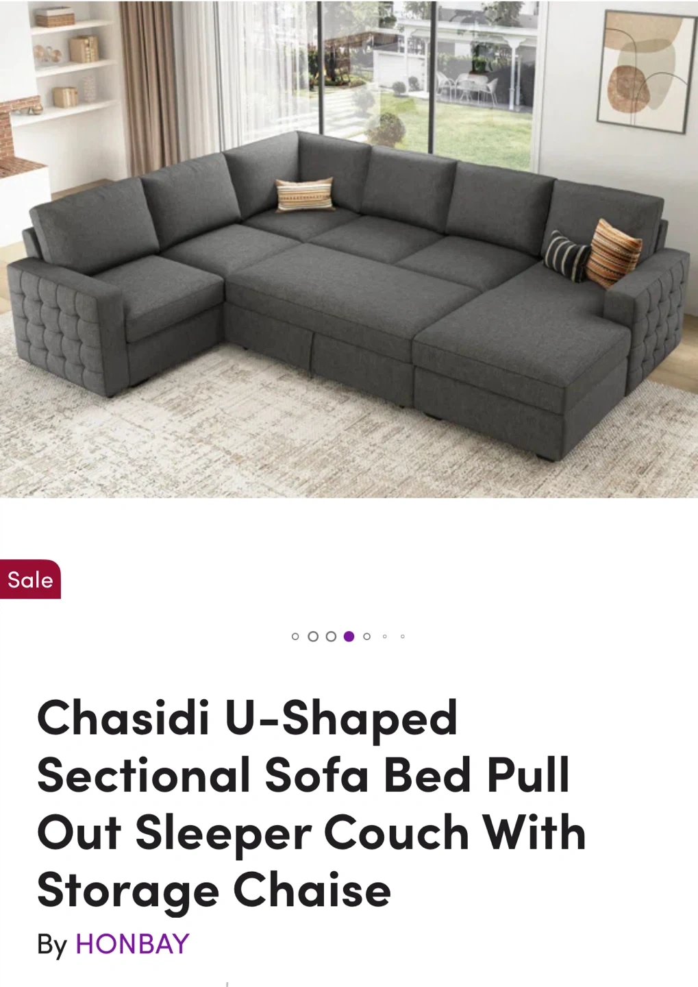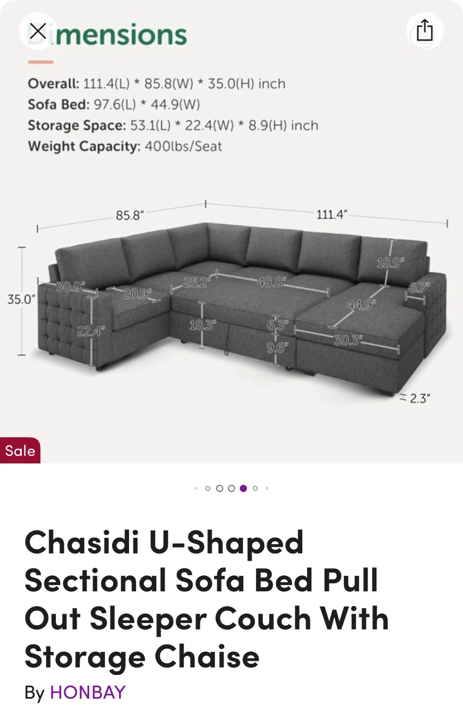 Dark grey u-shaped sectional sofa that converts to a bed. Storage chaise section handy to keep linen inside.