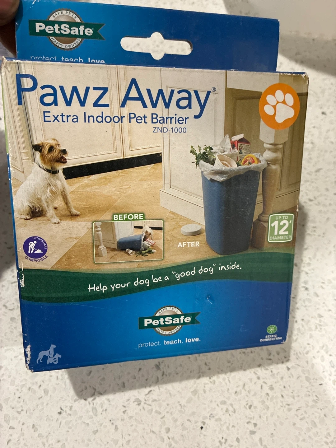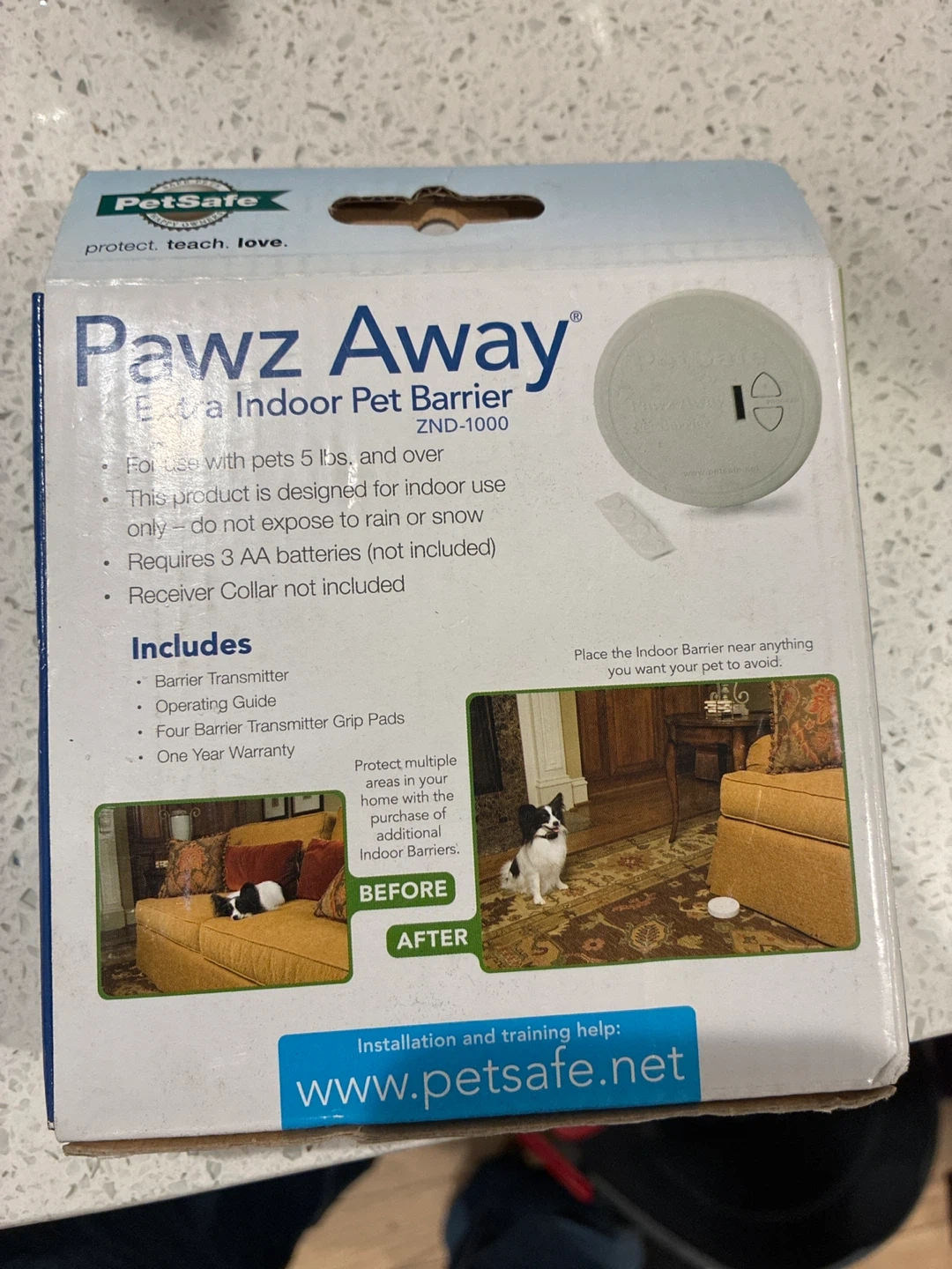 This PetSafe Pawz Away Extra Indoor Pet Barrier helps train your dog to stay inside designated areas. It's designed for indoor use only and requires 3 AA batteries, which are not included. The barrier can protect multiple areas in your home with additional purchase of indoor barriers.