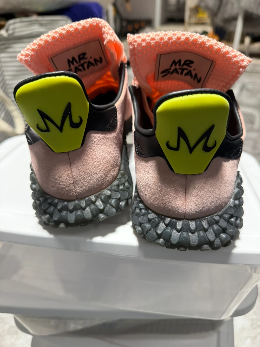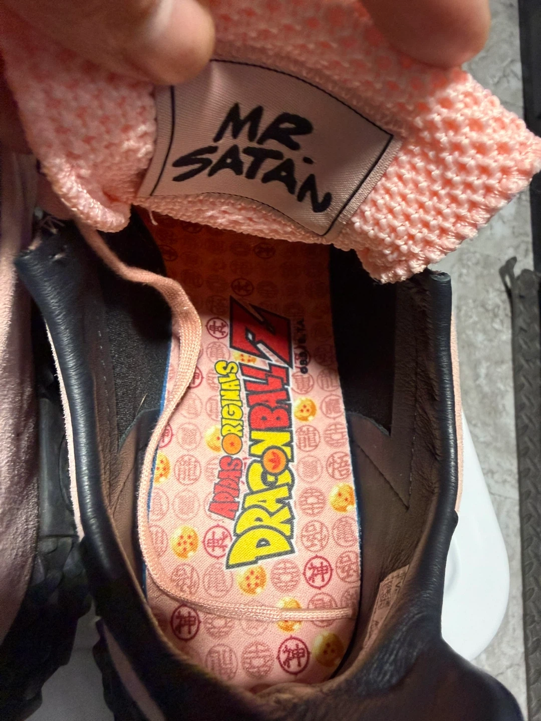 Adidas Kamanda "Mr. Satan" Dragon Ball Z collaboration sneakers. These feature a pink suede and mesh upper with black accents and a distinctive rugged sole. They include Dragon Ball Z themed insoles and "Mr. Satan" branding on the tongue. US Men's size 9.5