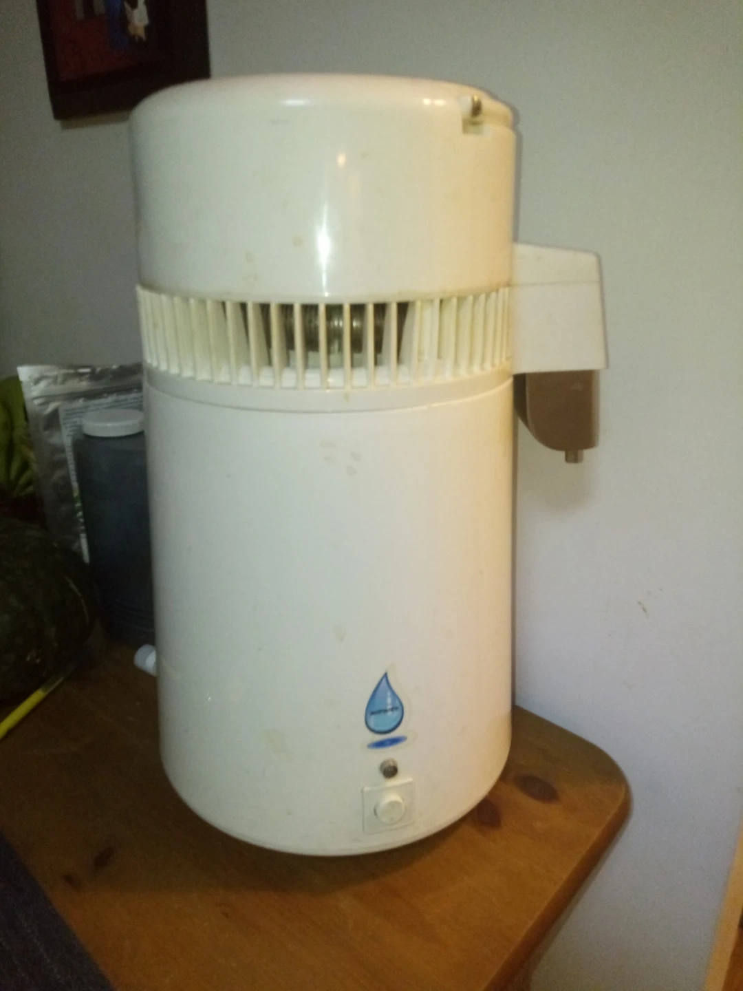 This is a white water distiller. It has a blue water drop logo on the front. It includes a power button and a dial for operation. This appliance is designed to purify water through distillation.