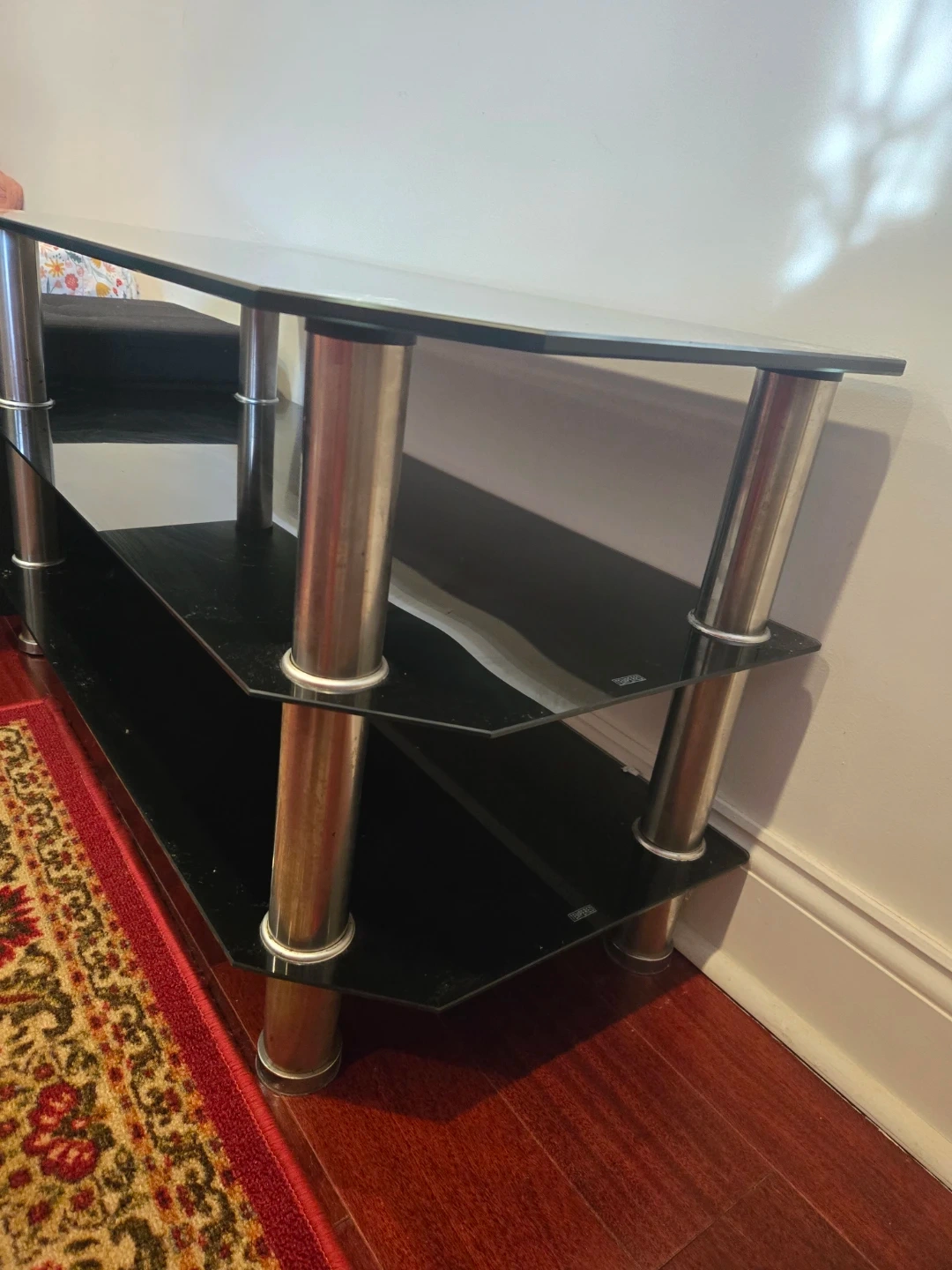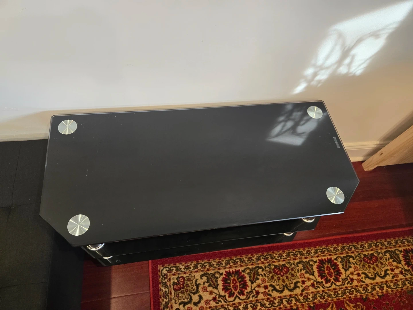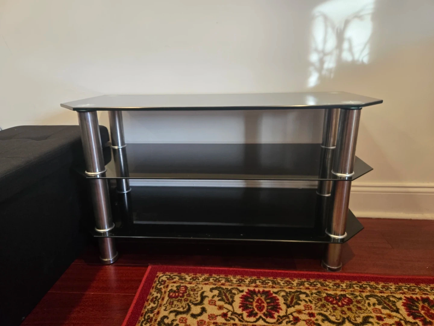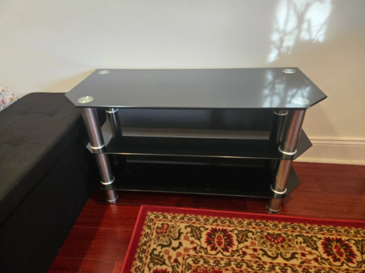 Selling a sleek black glass table. It has three shelves, providing plenty of space.. The stand is in great condition and is strong enough to hold high weights.