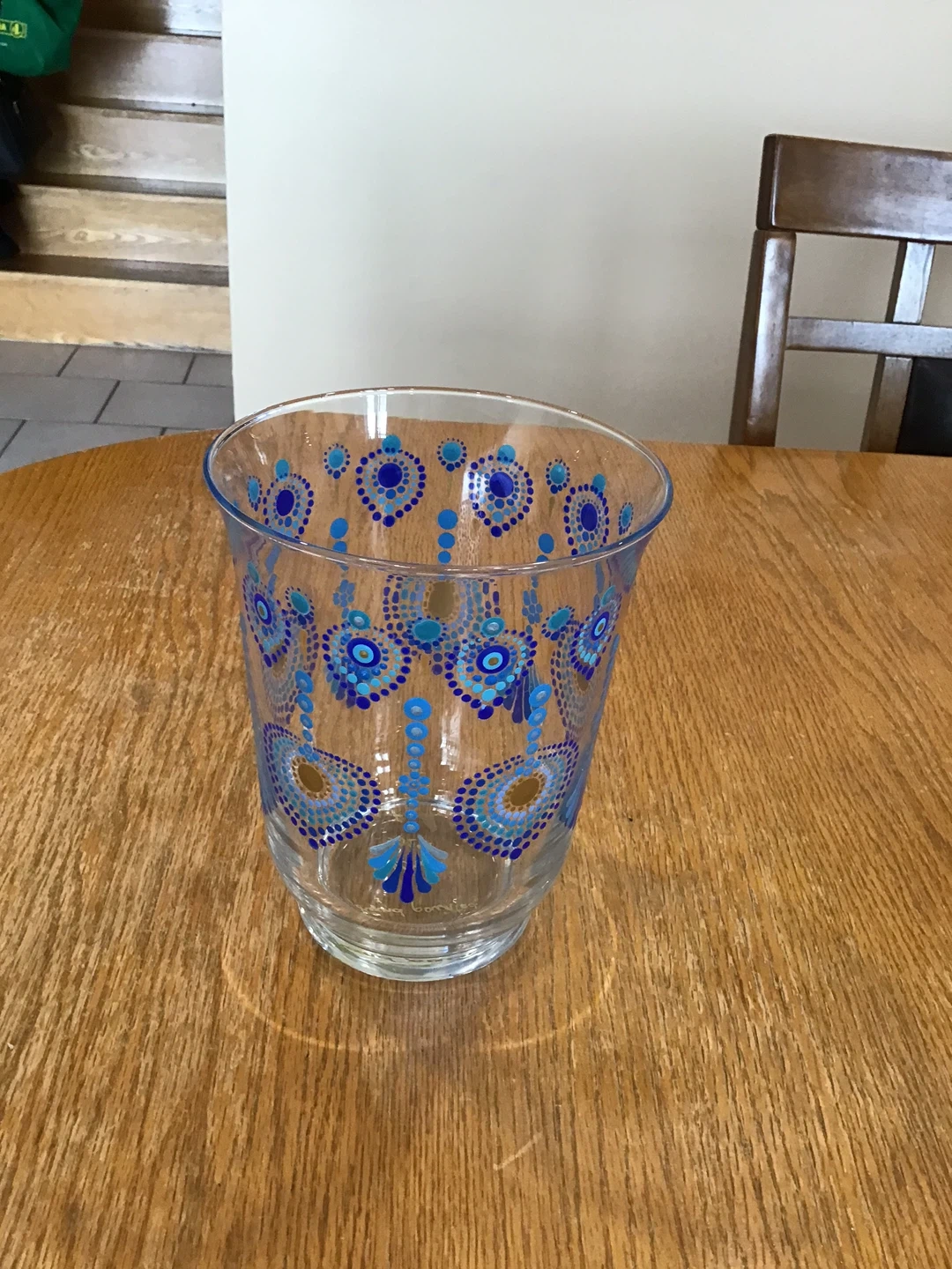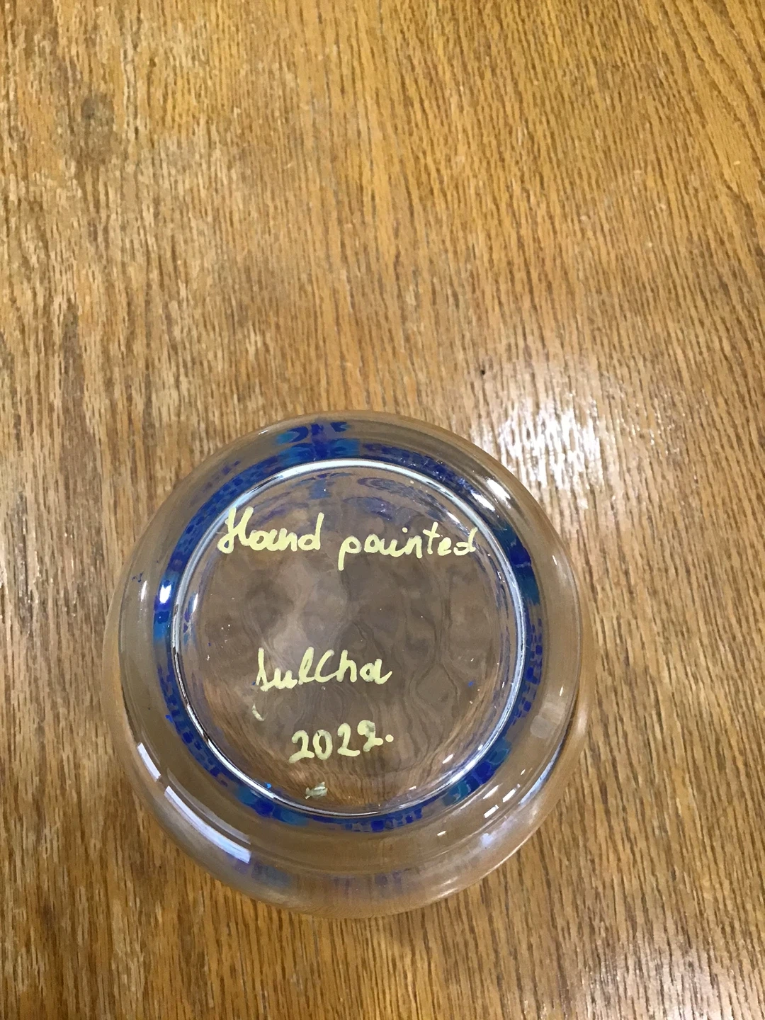 This is a lovely hand-painted glass bowl by Sulcha! It features a unique blue pattern that would add a touch of elegance to any room. It was painted in 2022.