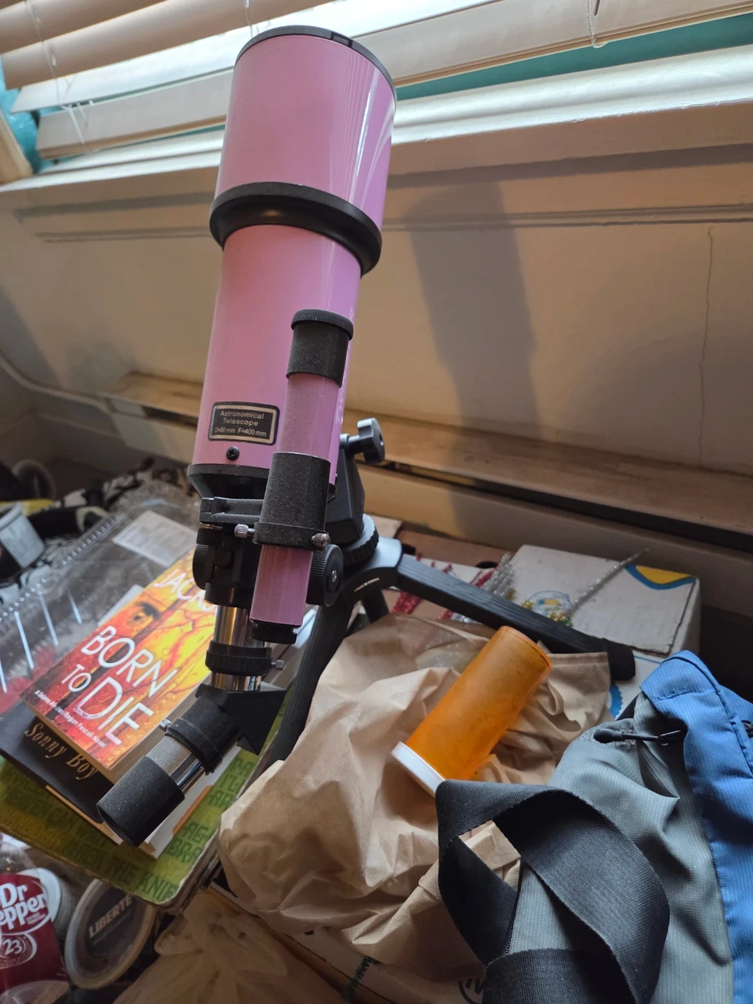 This is a pink astronomical telescope. It has a Dx80mm aperture and a 400mm focal length. It's mounted on a tripod for stability. Great for viewing the night sky!