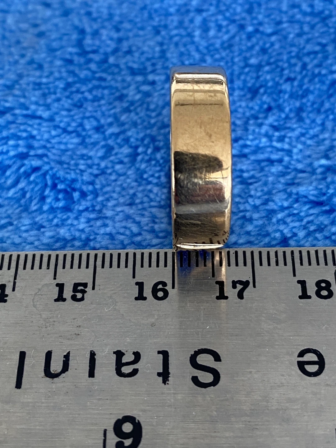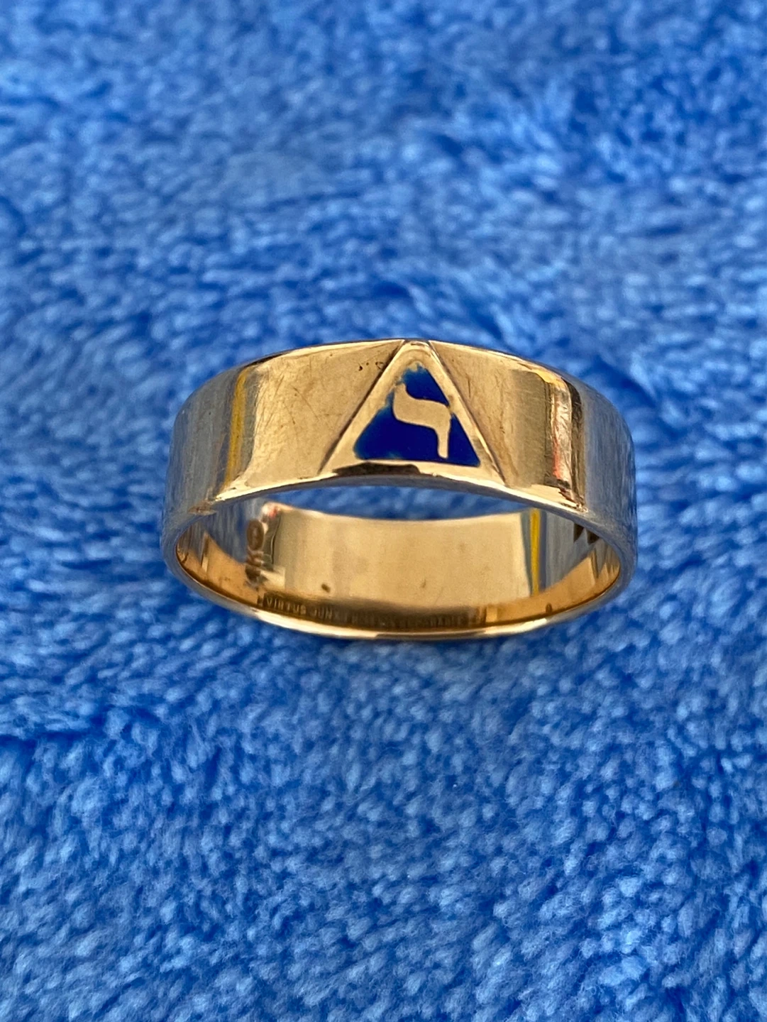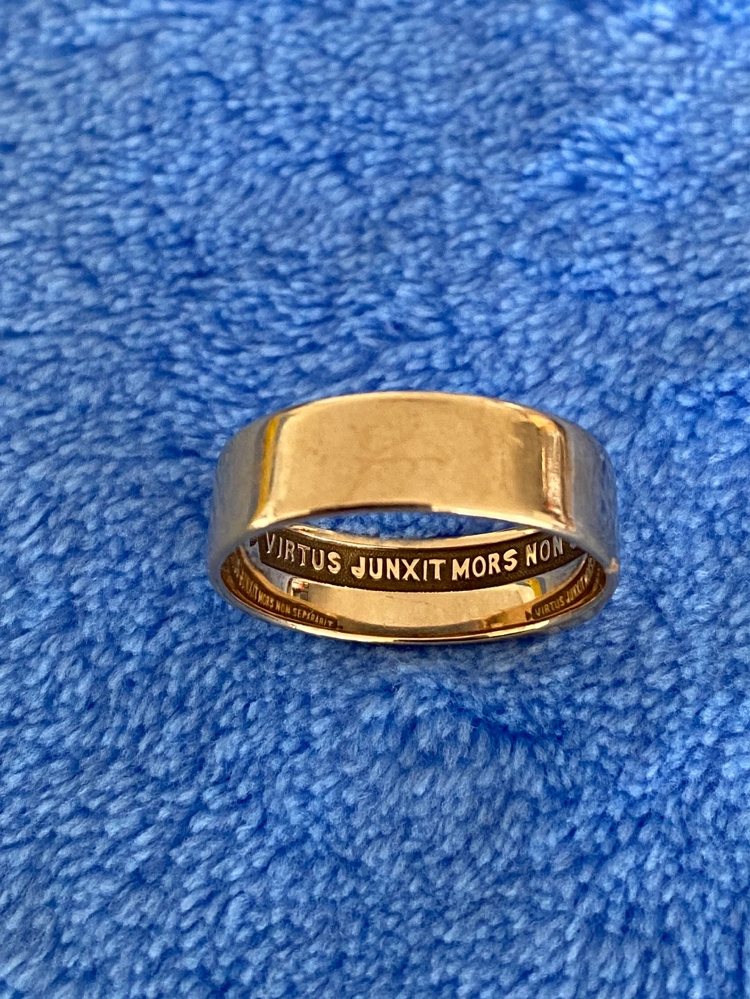 This 14k gold ring features an engraved Latin phrase "VIRTUS JUNXIT MORS NON SEPARABIT" on the inside band. It also has a blue enamel inlay with a symbol on the exterior. The ring weighs 6 grams. Size 10.