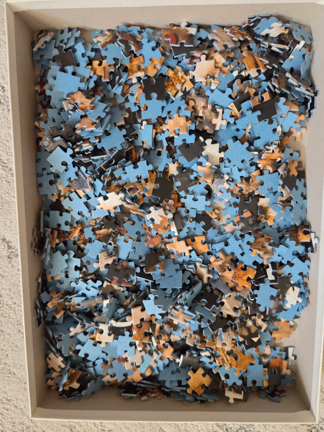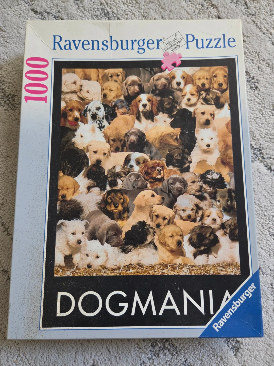 Ravensburger 1000 piece puzzle titled Dogmania. It's a fun puzzle featuring a collection of puppies. Includes the original box and all of its pieces.