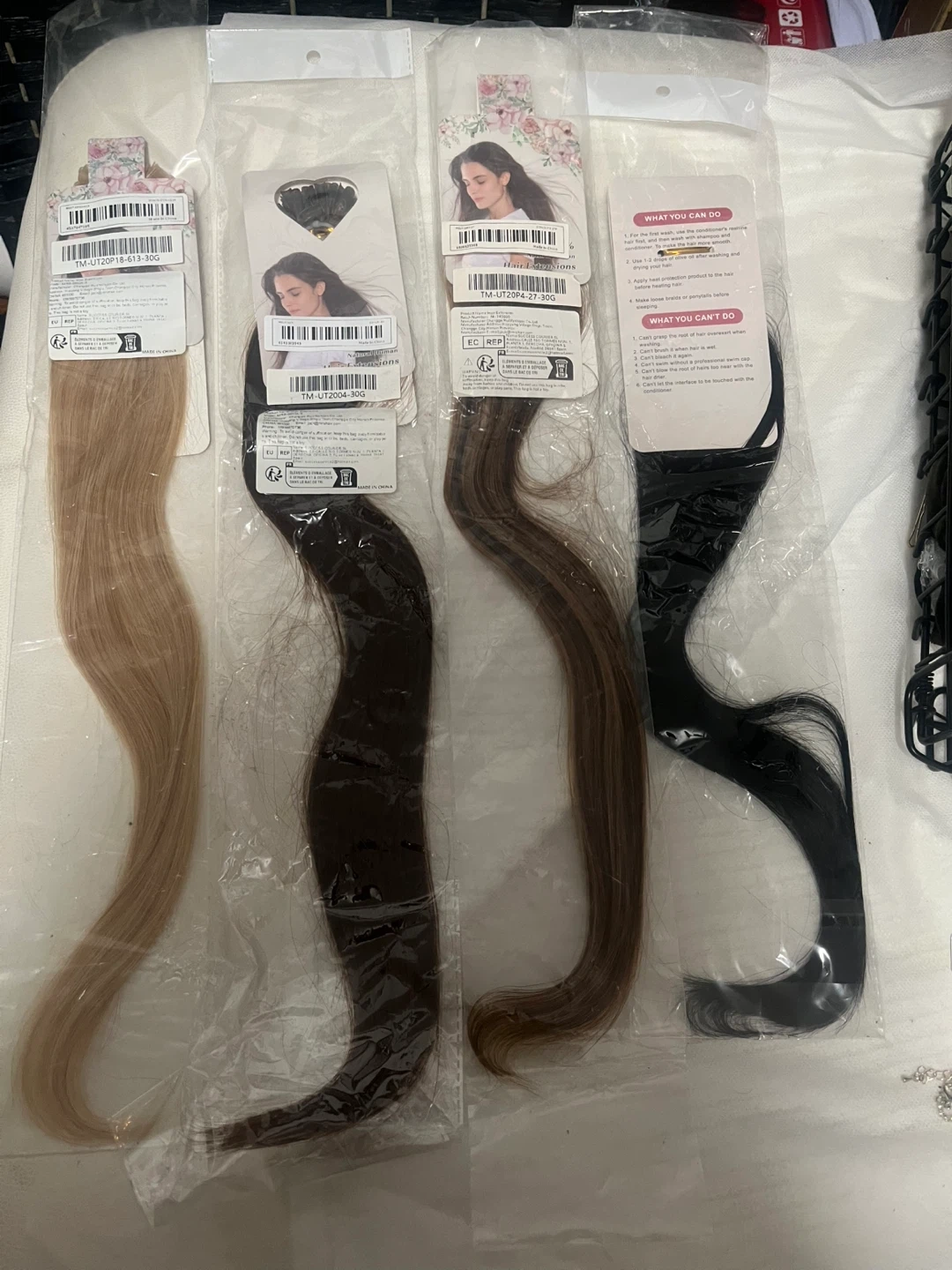 Four different colored clip-in hair extensions. Includes blonde, dark brown, light brown, and black shades. Each piece is designed for easy application. Add length and volume to your hair instantly!