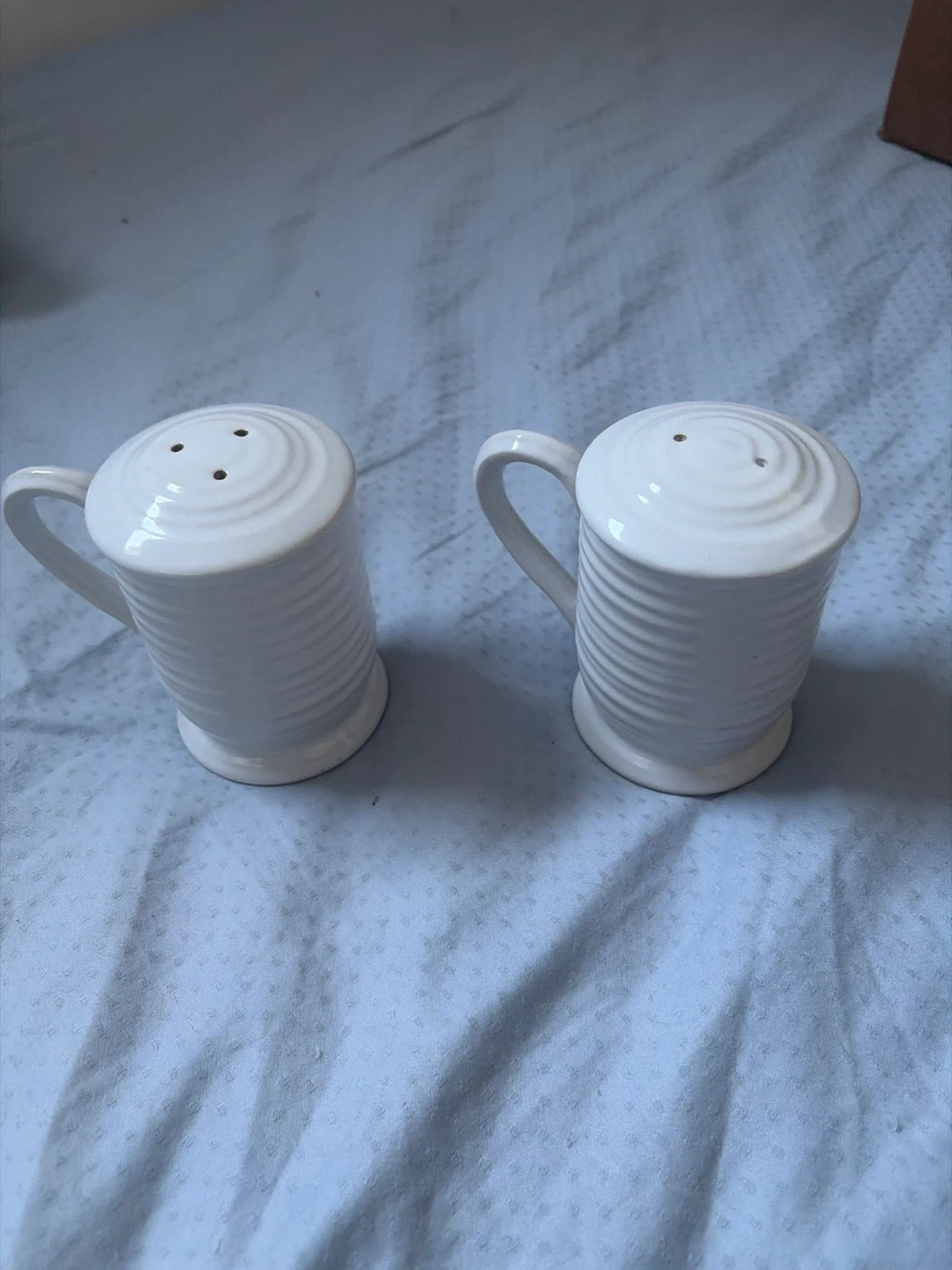 A set of two white ceramic salt and pepper shakers. They have a ribbed design and handles. Perfect for seasoning meals at the table!