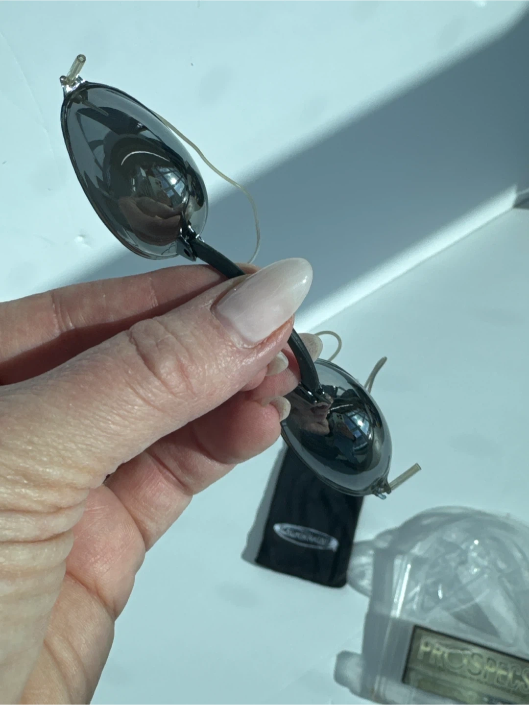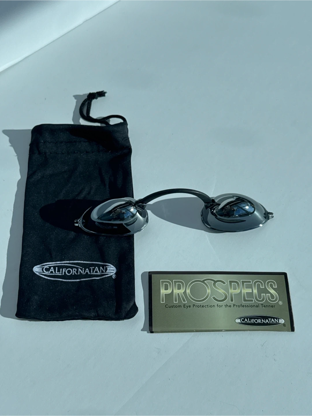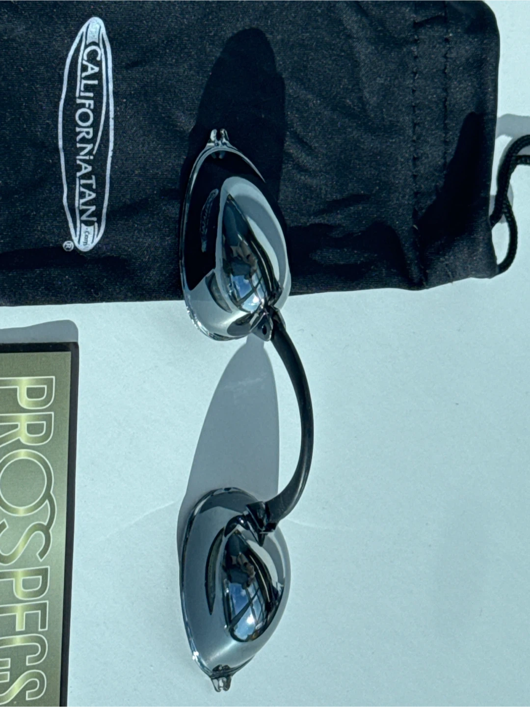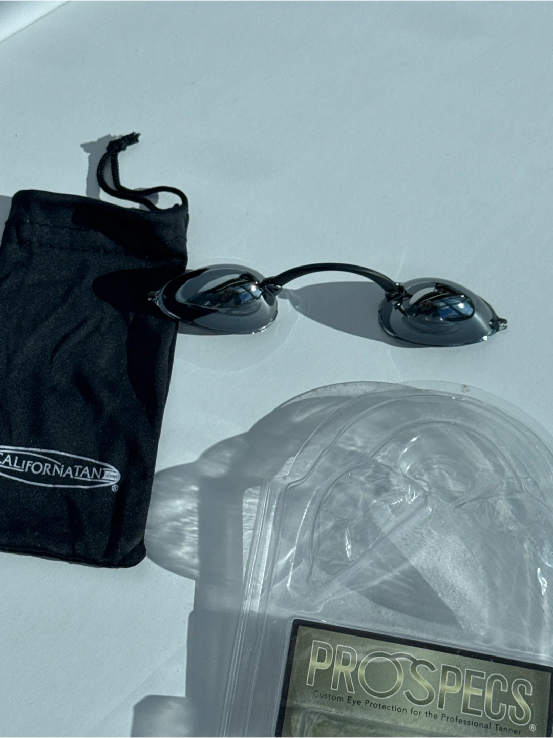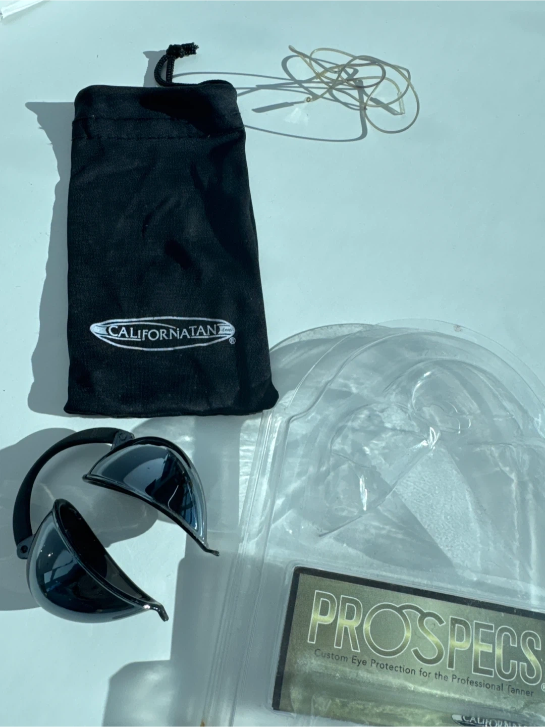 Californiatan tanning goggles eye protection, includes a protective pouch, thin, clear, plastic strap, and the original packaging. Never used. These are custom eye protection for professional tanners and son worshipers.