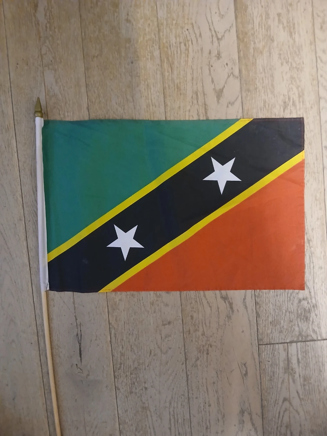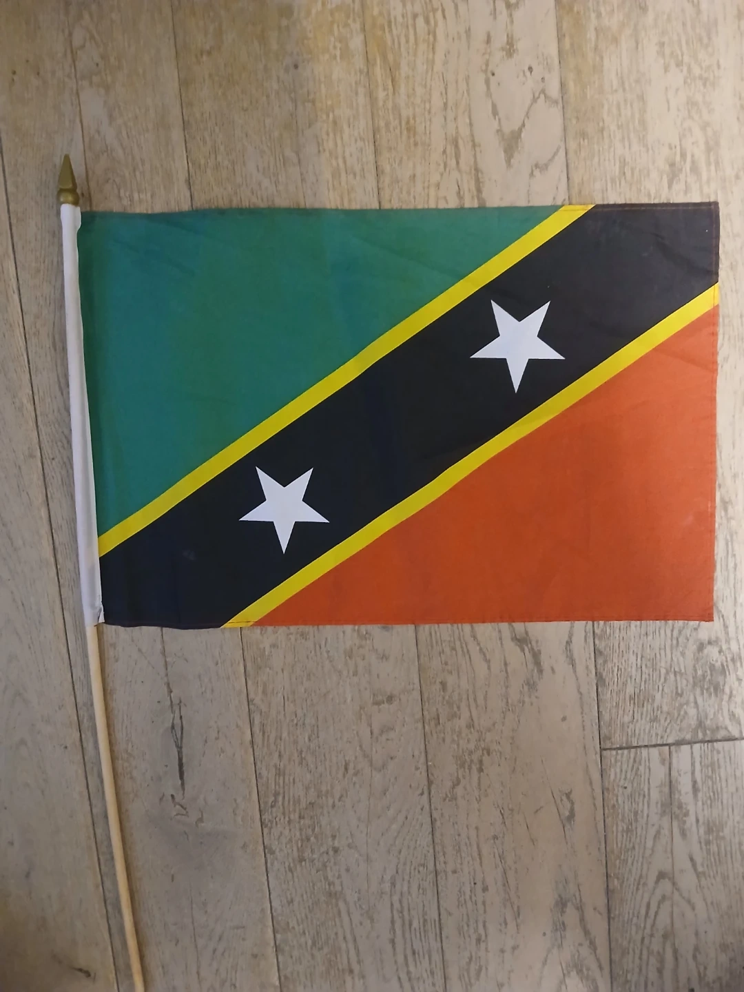 This is a small decorative flag featuring the Saint Kitts and Nevis national colors and emblems. It's mounted on a lightweight wooden pole. Great for displaying national pride or as a souvenir!
