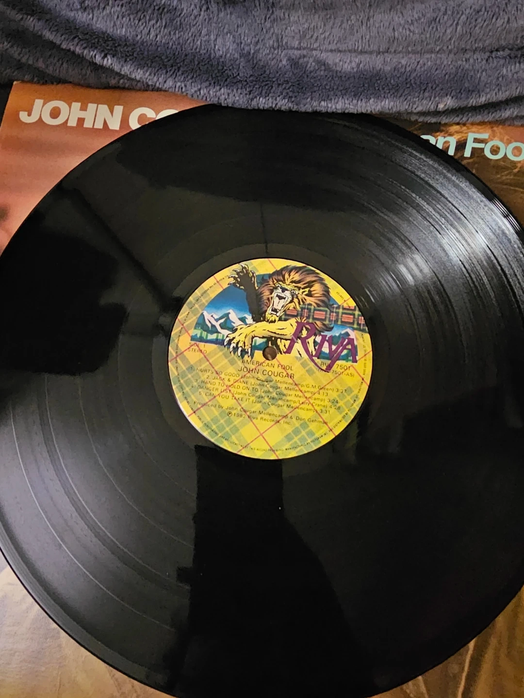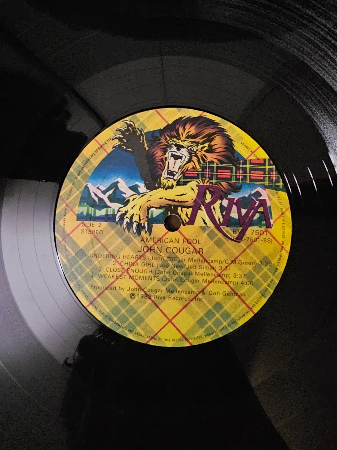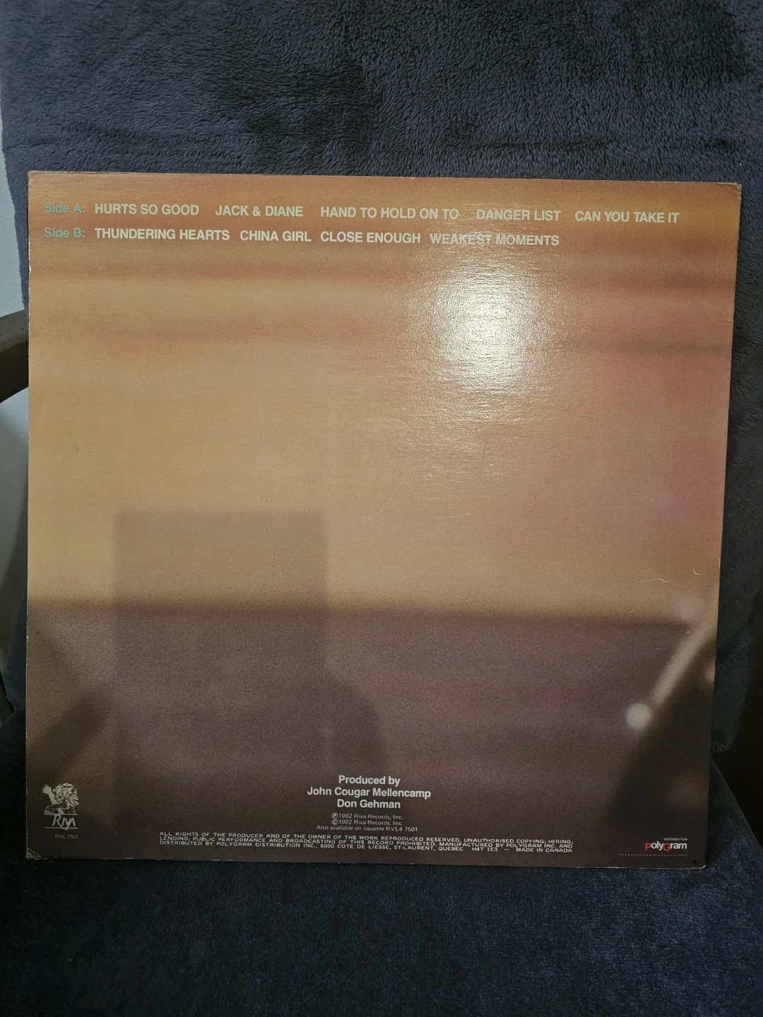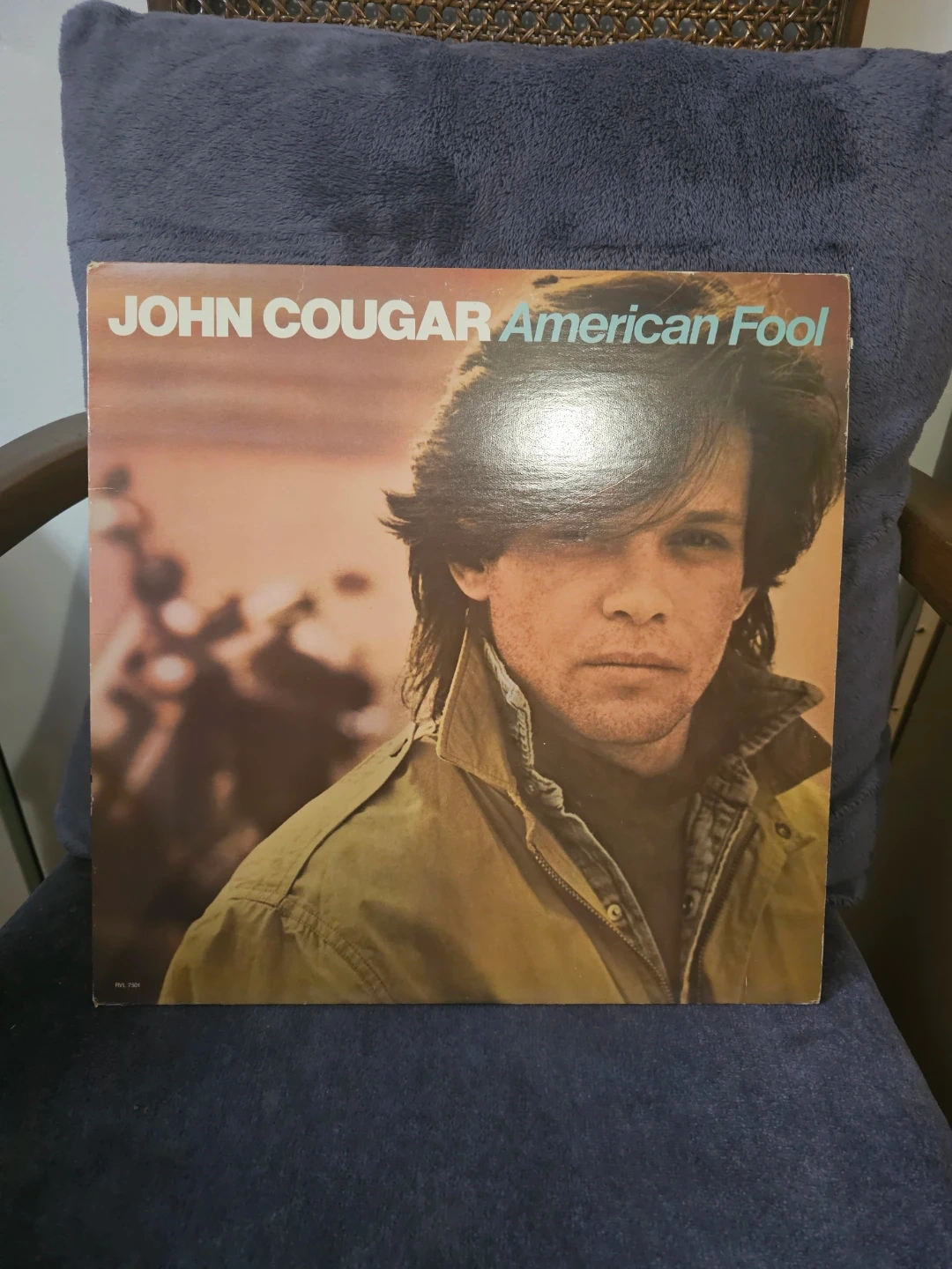 This is John Cougar's American Fool vinyl LP record. It was released in 1982 by Riva Records. The album features hits like 'Hurts So Good' and 'Jack & Diane'.