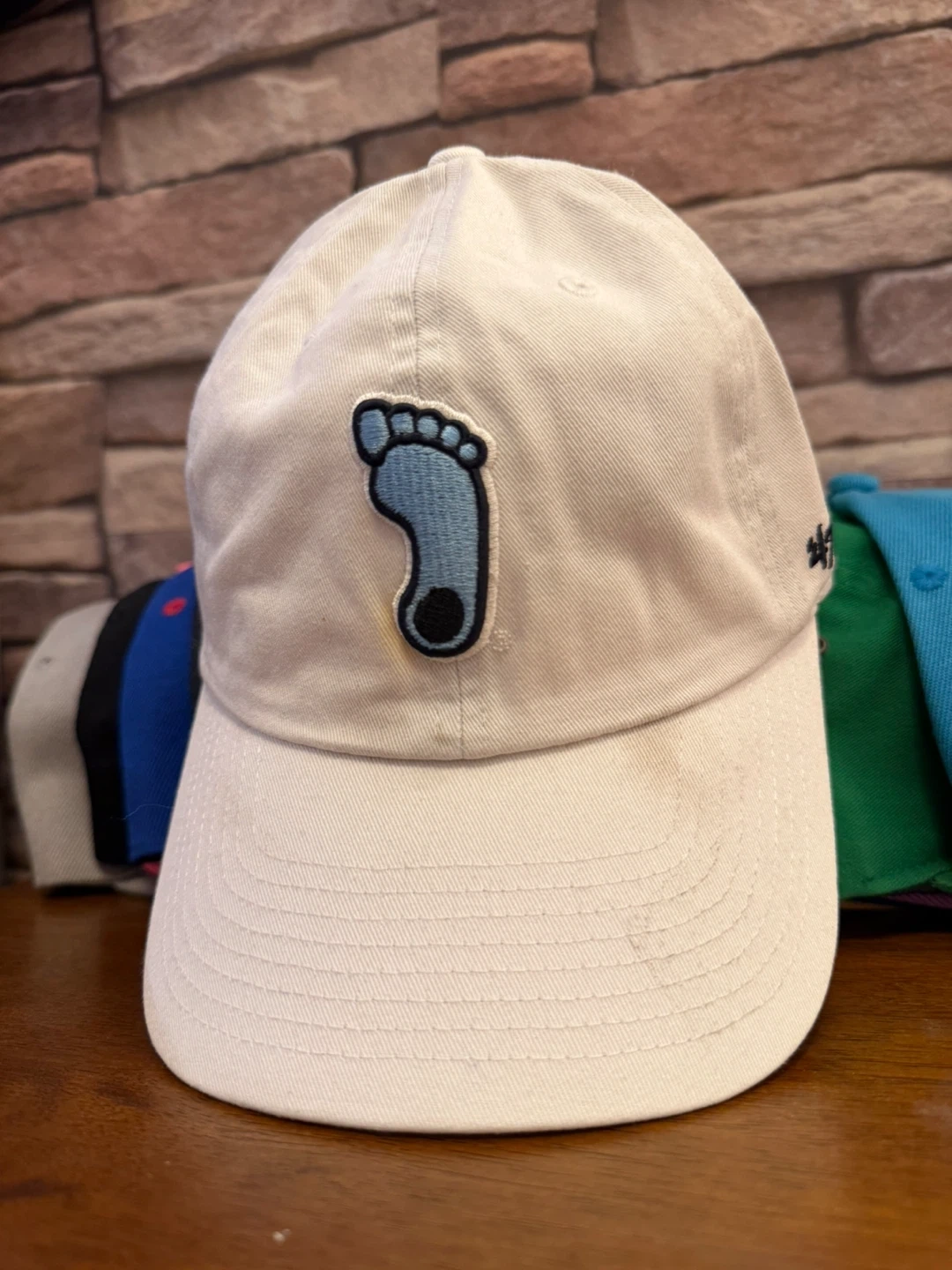 White baseball cap featuring a blue embroidered foot logo on the front. This cap is made of cotton. It's a comfortable accessory for everyday wear.
