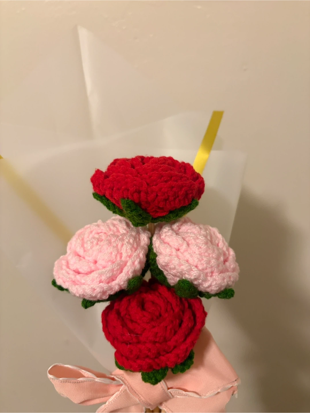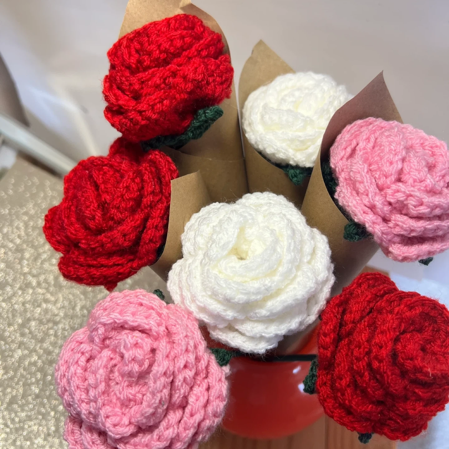 A lovely bouquet featuring six crocheted roses in red, pink, and white. Handcrafted from yarn, these artificial flowers offer a charming and long-lasting decoration. These would make a sweet gift for someone special!