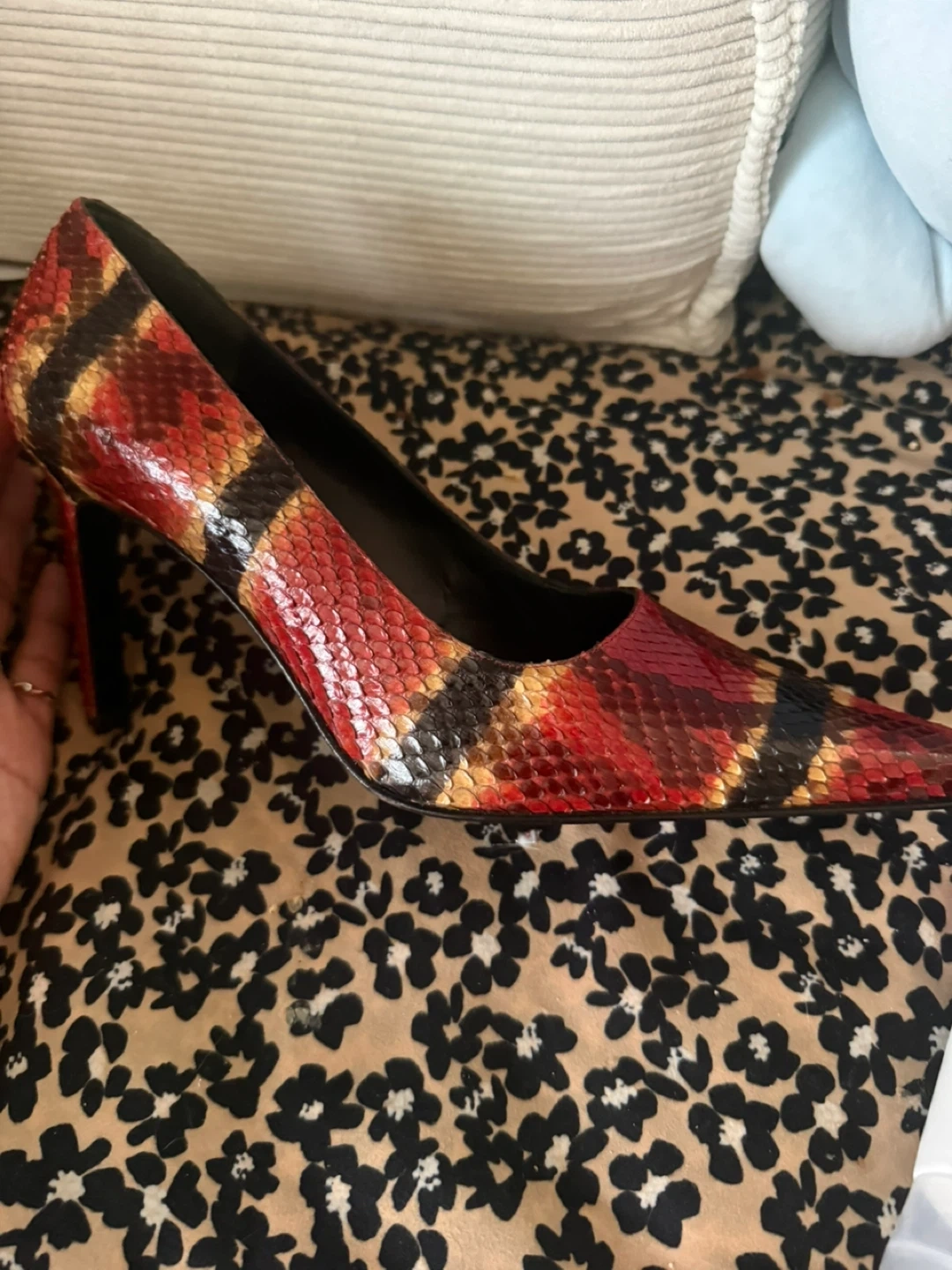 These stylish stiletto heels feature a striking snake print in red, black, and tan. The pointed toe and elegant silhouette make them a great addition to any outfit. They have a classic pump design.