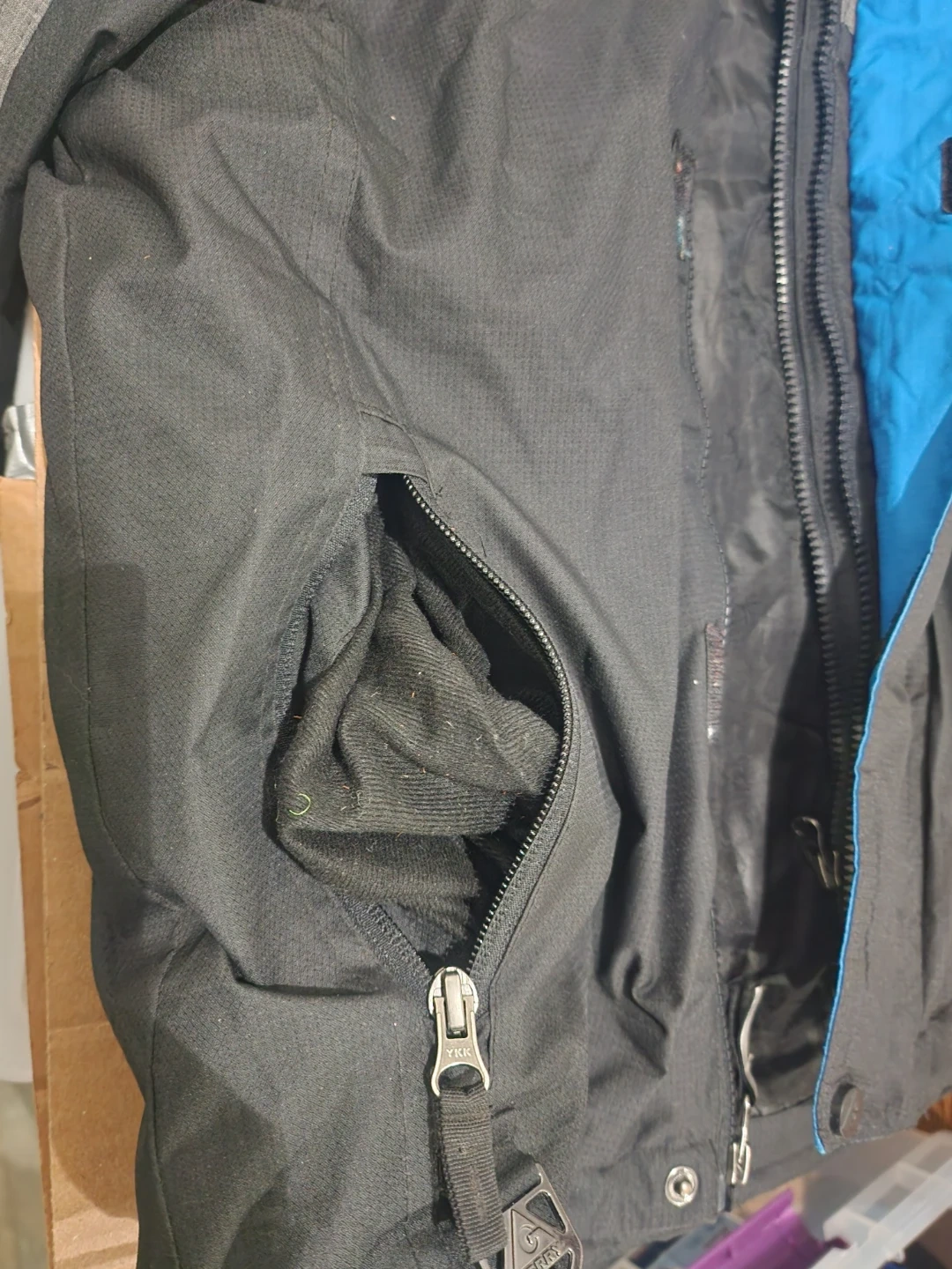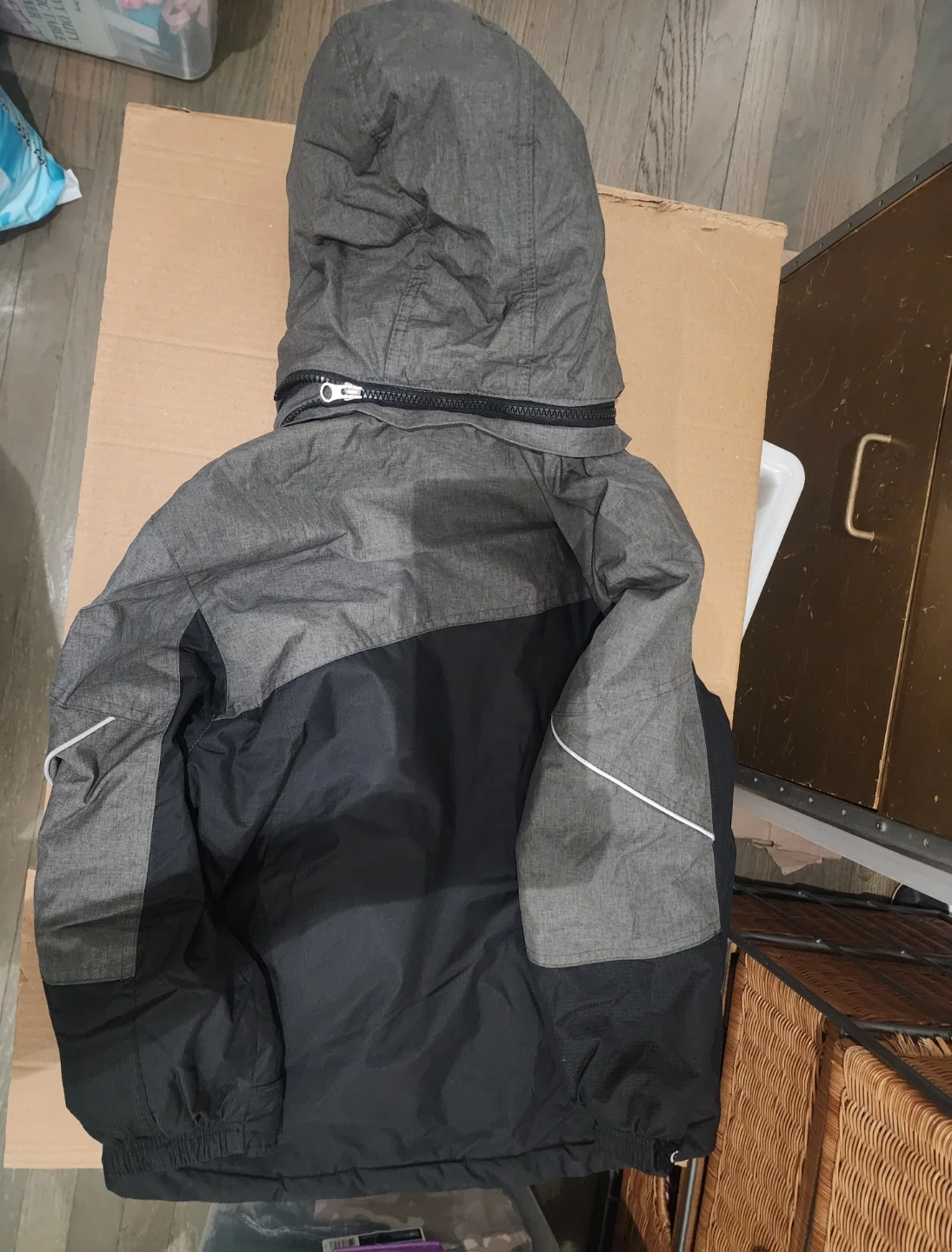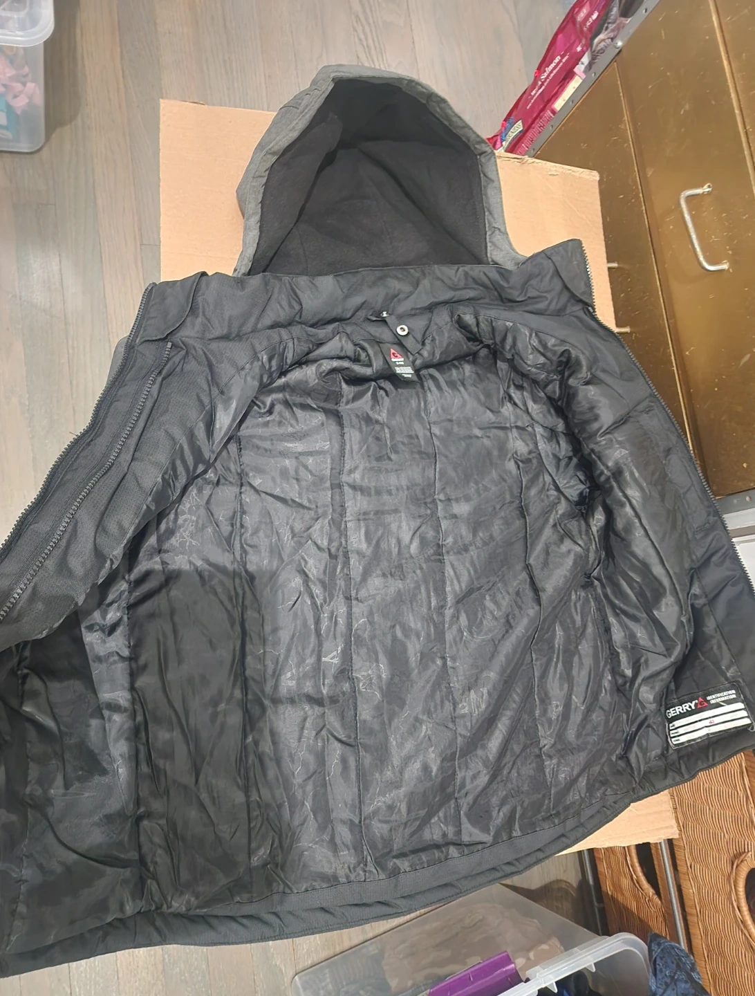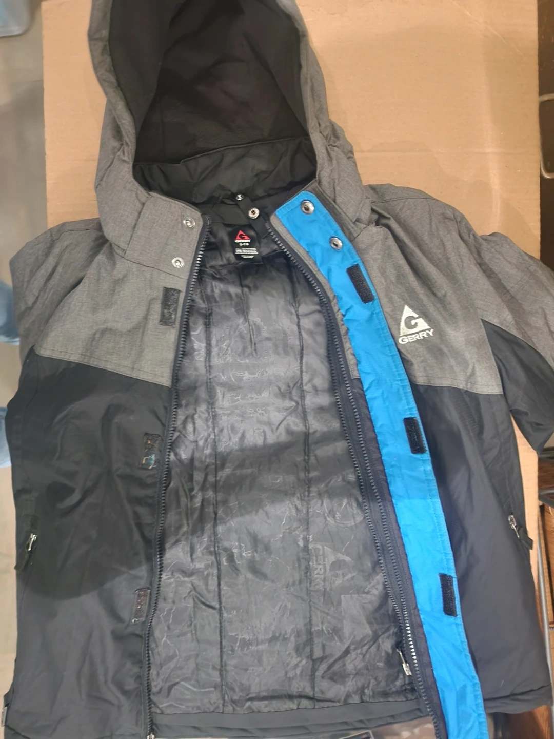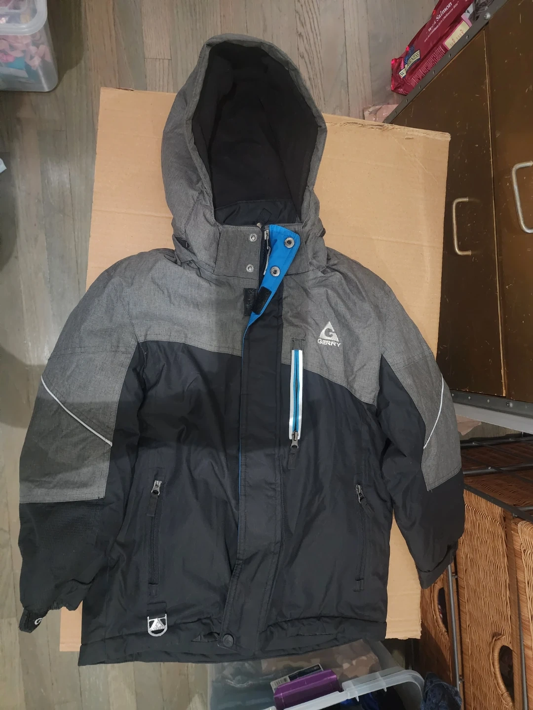 This Gerry boys' winter jacket is designed for warmth and durability. It features a full zip front, multiple pockets, and a hood for added protection. The exterior is a blend of grey and black, with a bright blue accent on the storm flap. Pockets and hoodie have fleece lining.