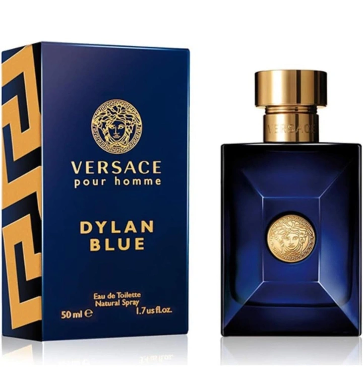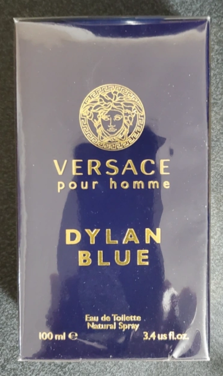 A bottle of Versace Dylan Blue men's cologne. It's 3.4 fl oz and comes in the original packaging.