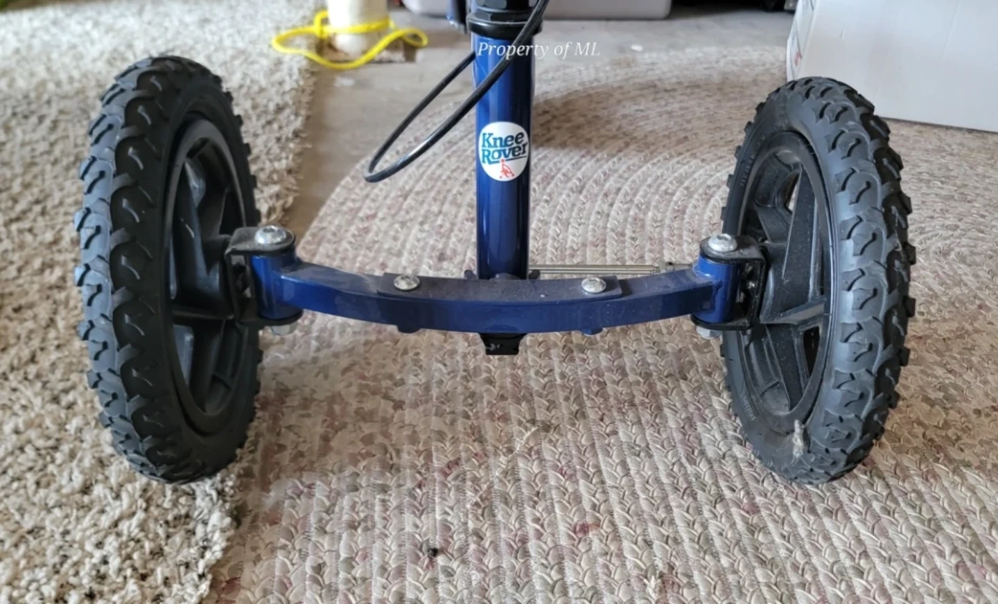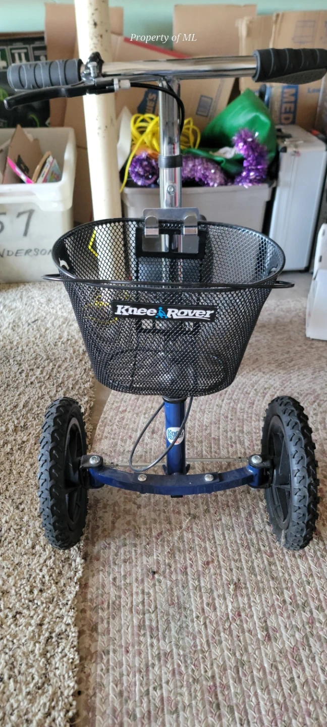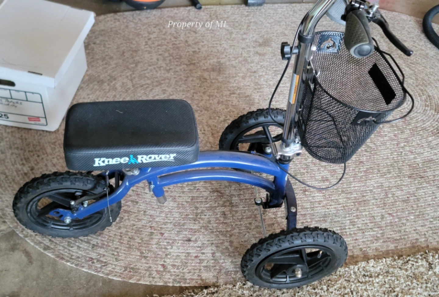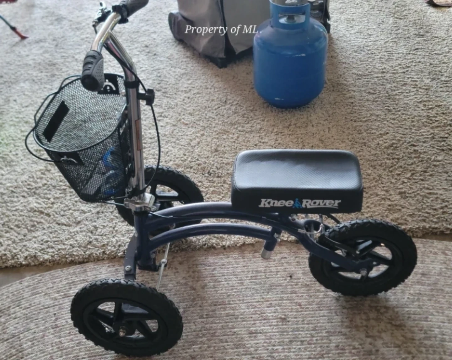 This blue 3-wheel mobility scooter from KneeRover is designed for convenient personal transportation. It features a large mesh basket for carrying essentials. The sturdy frame and three wheels offer stability for users. Ideal for individuals needing assistance with mobility.