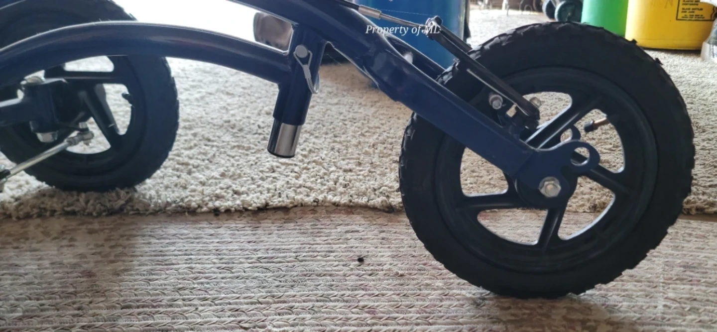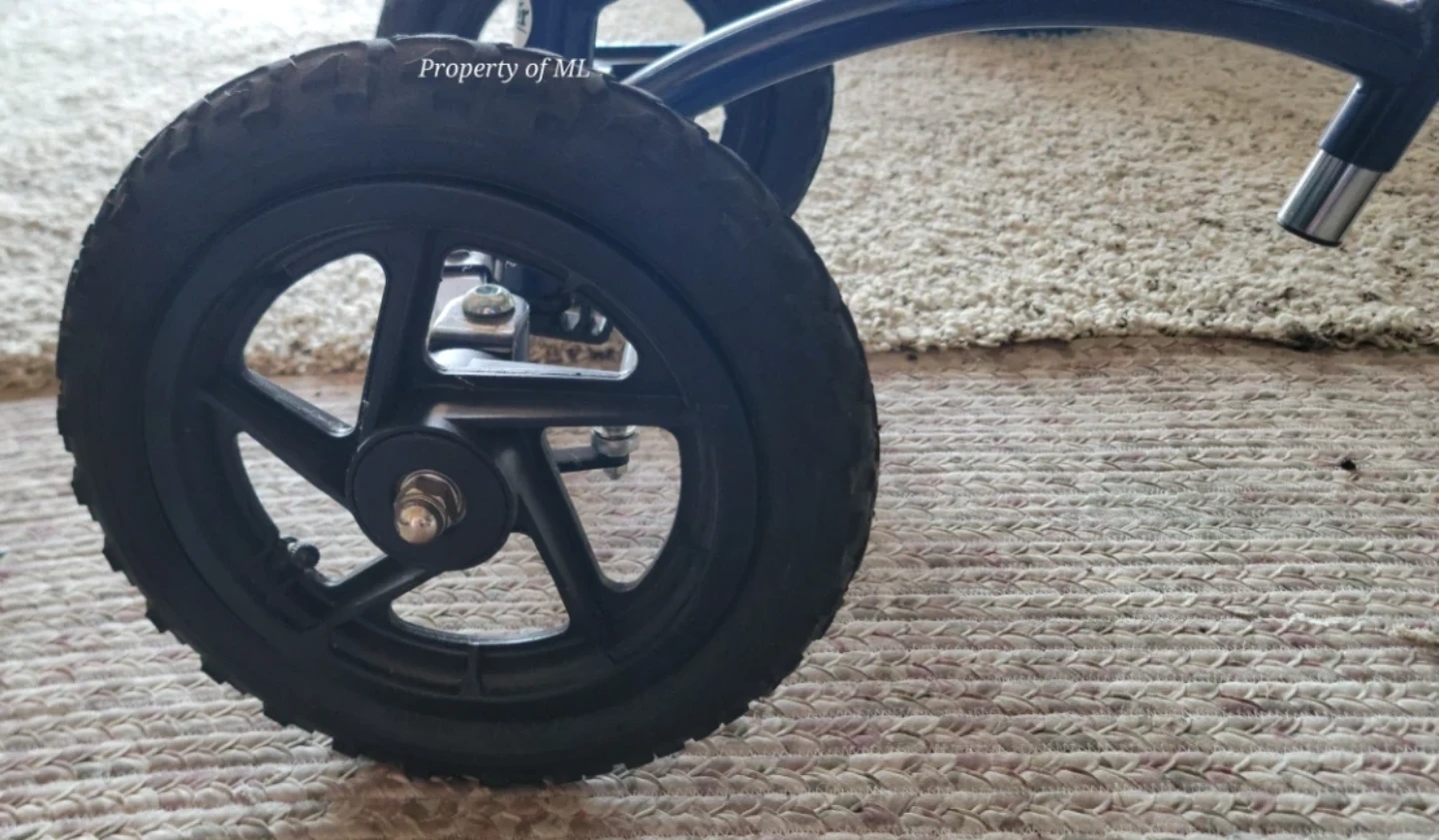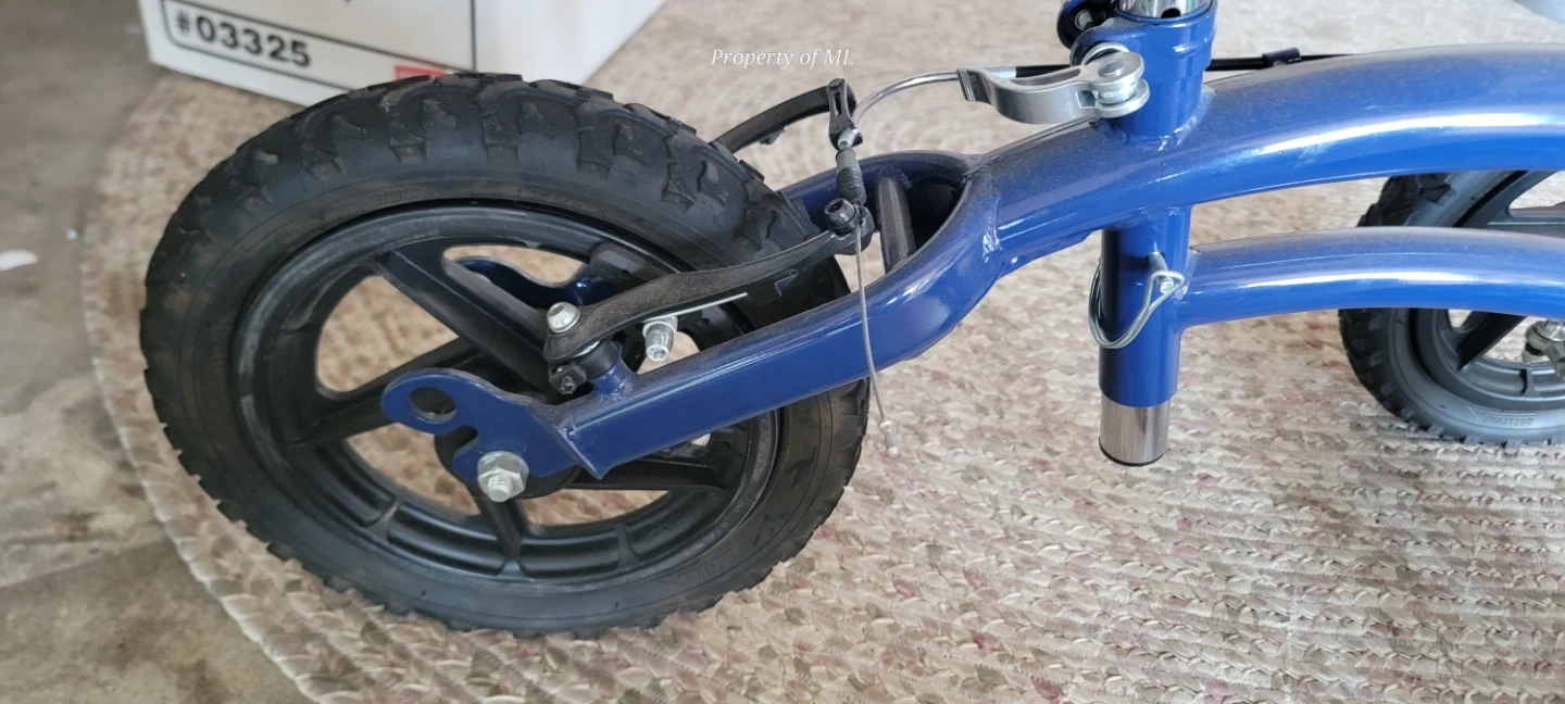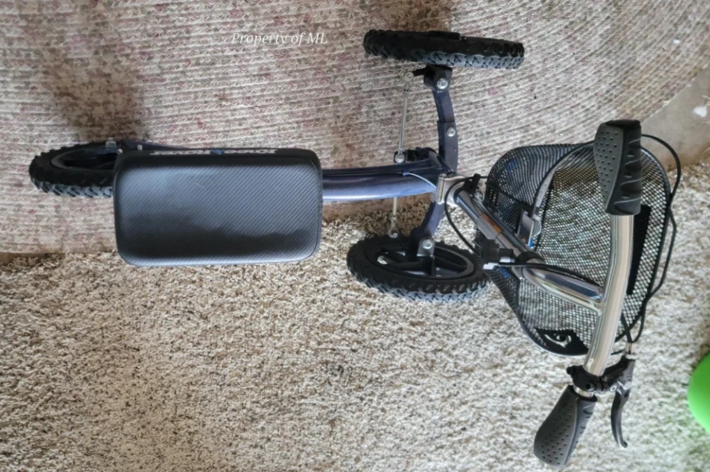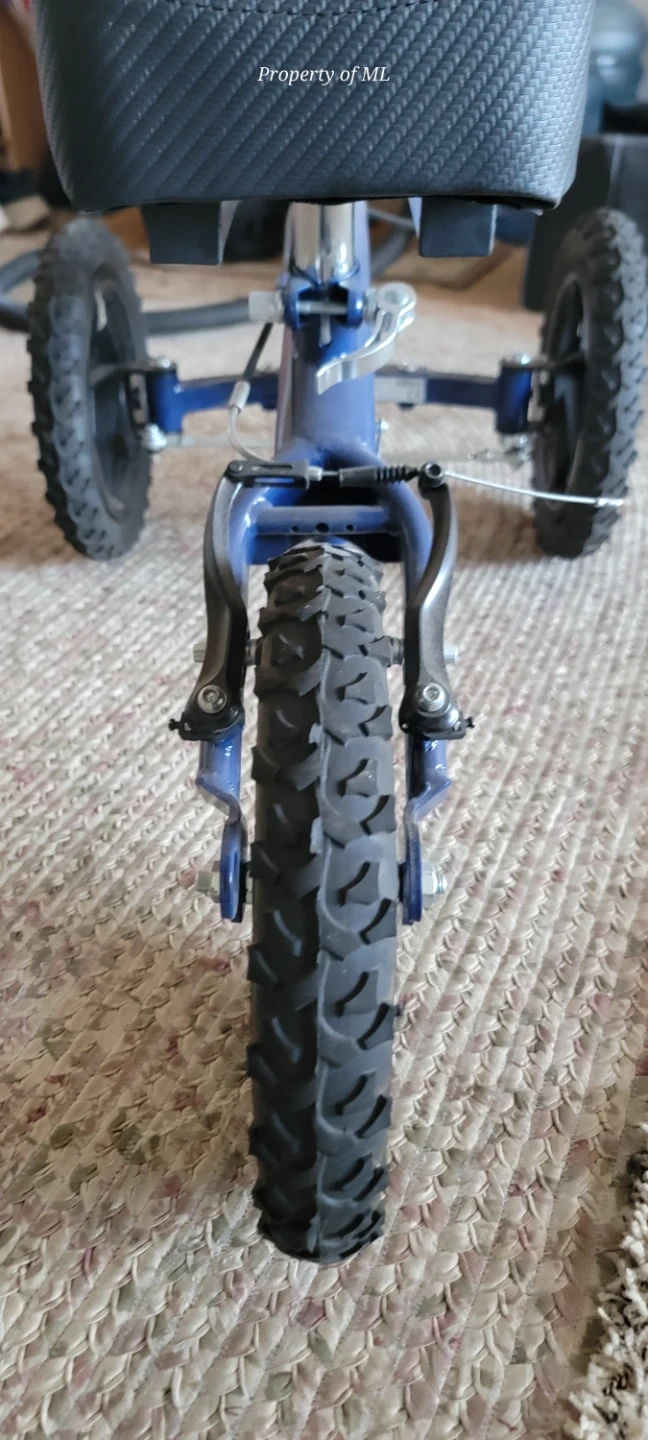 This blue 3-wheel mobility scooter from KneeRover is designed for convenient personal transportation. It features a large mesh basket for carrying essentials. The sturdy frame and three wheels offer stability for users. Ideal for individuals needing assistance with mobility.