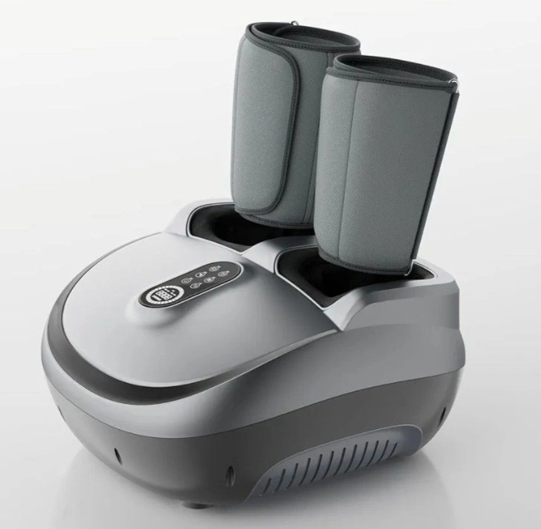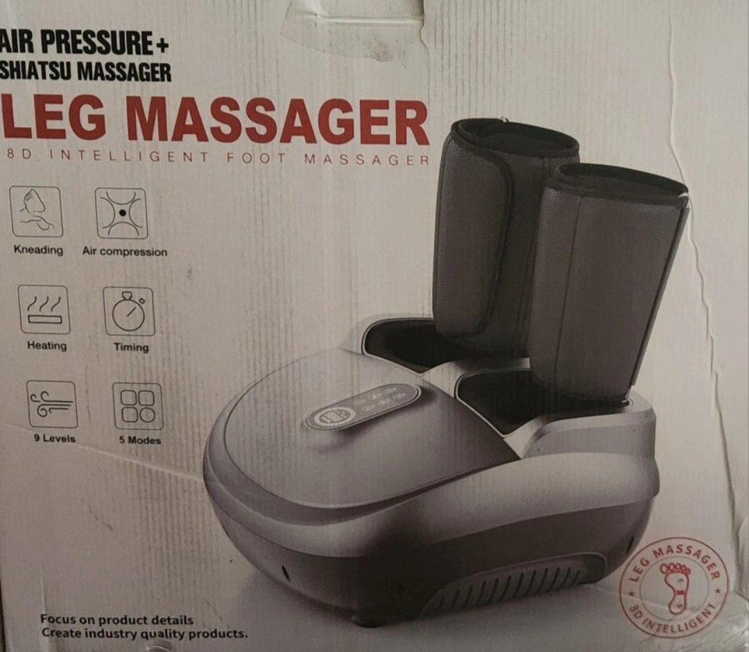 Brand new leg and foot massager. Features air compression, shiatsu massage, and heat. Multiple settings and intensity levels. Includes leg wraps. Unopened box.