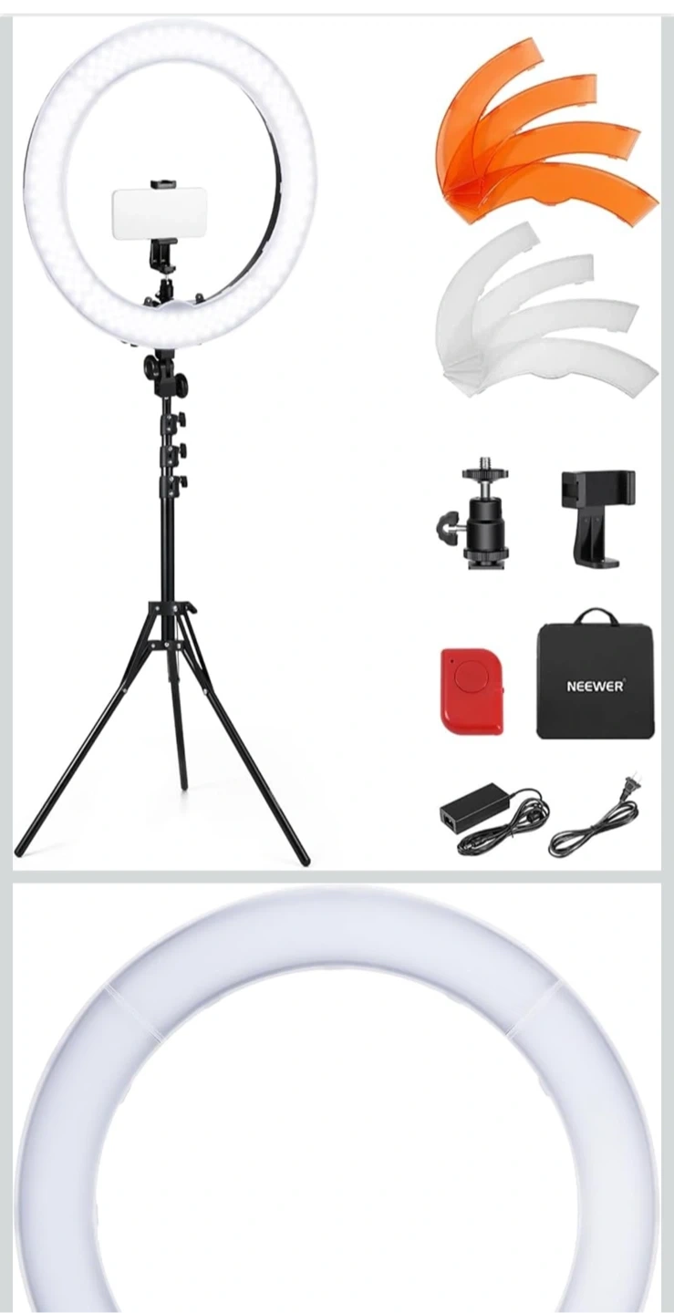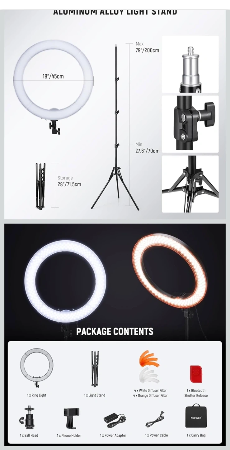 This is an 18-inch LED ring light kit from Neewer. It includes a light stand, ball head, phone holder, power adapter, power cable, Bluetooth remote, and carrying bag. Also comes with 4 white and 4 orange diffuser filters. Max height 79 inches, min height 27.6 inches. Storage size 28 inches.