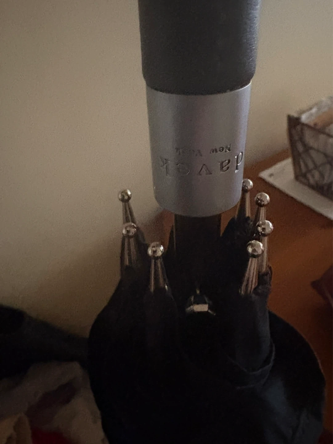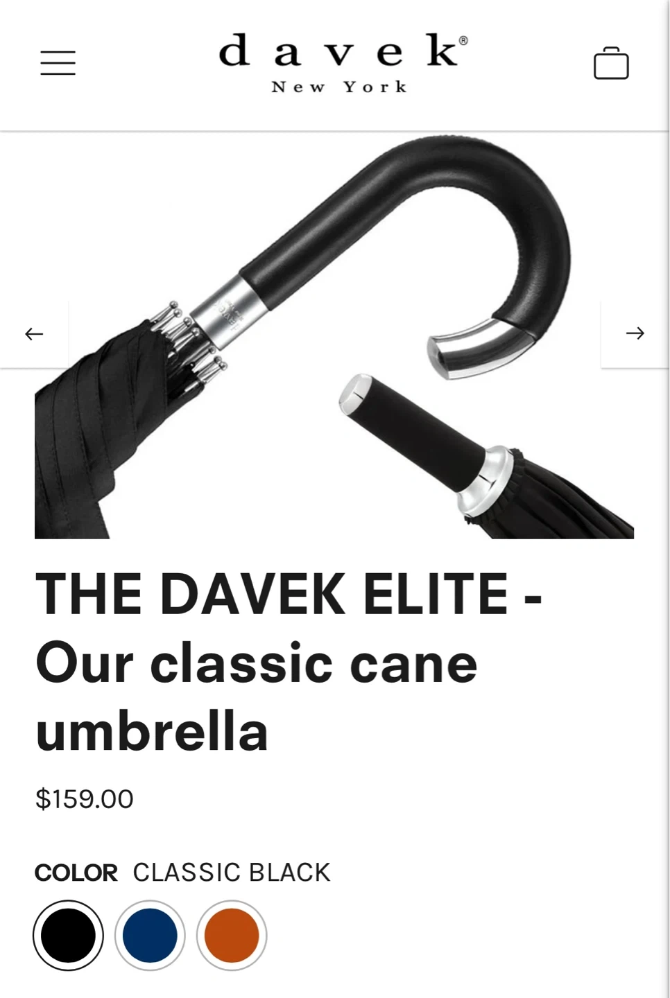 This is The Davek Elite, a classic cane umbrella in classic black. It's designed for durability and style. The umbrella features a sturdy frame and a comfortable handle.