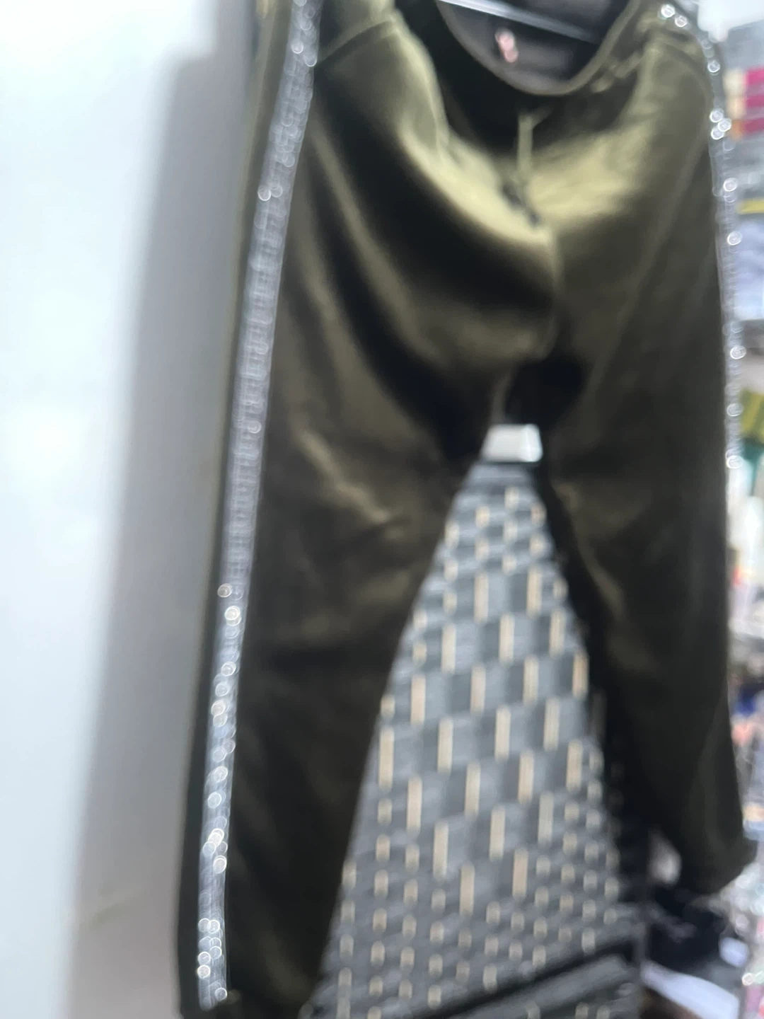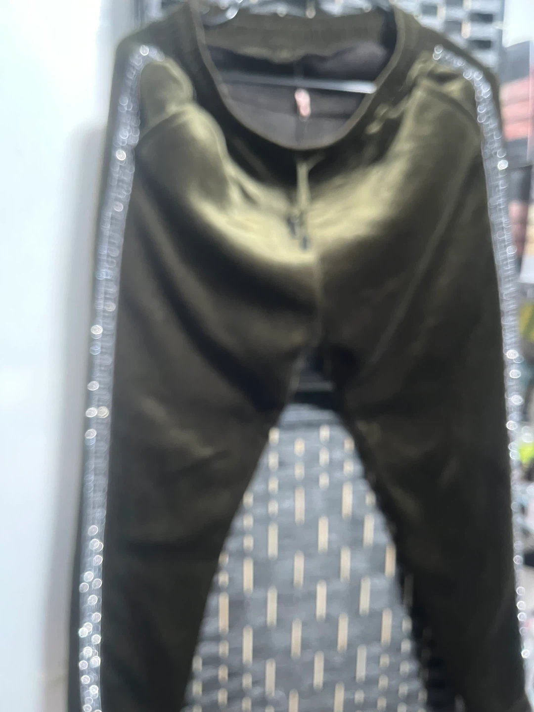 Olive green velour track pants. They feature a drawstring waist and rhinestone-embellished stripes along the sides. Material is soft and smooth. Perfect for casual wear!