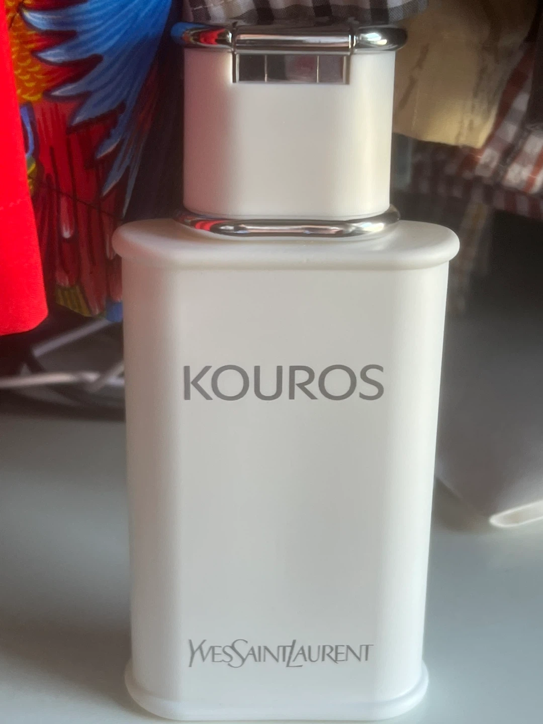 Classic Yves Saint Laurent Kouros Eau de Toilette for men. This fragrance comes in a clean white bottle with silver accents. An iconic scent that's been around for years!
