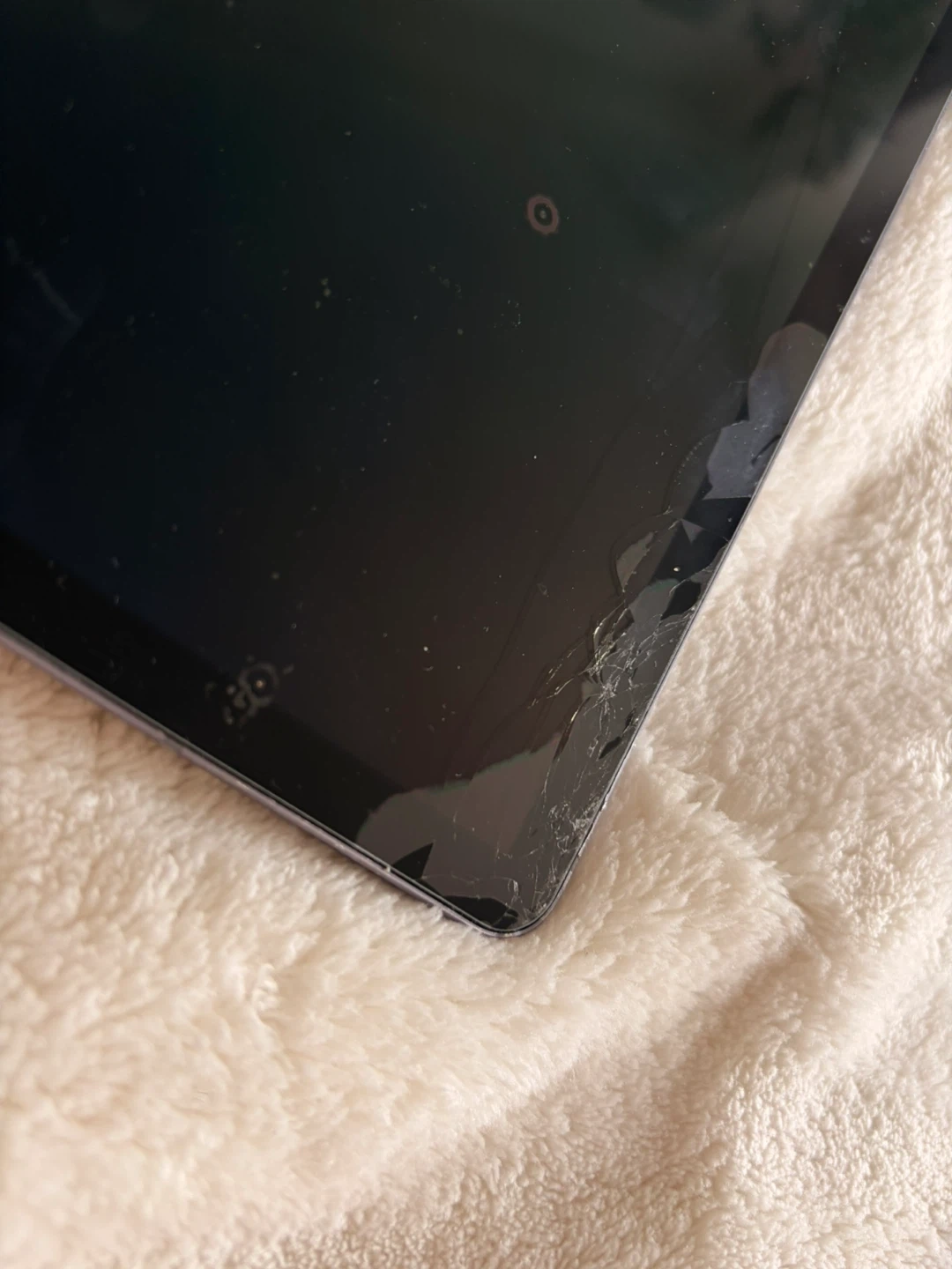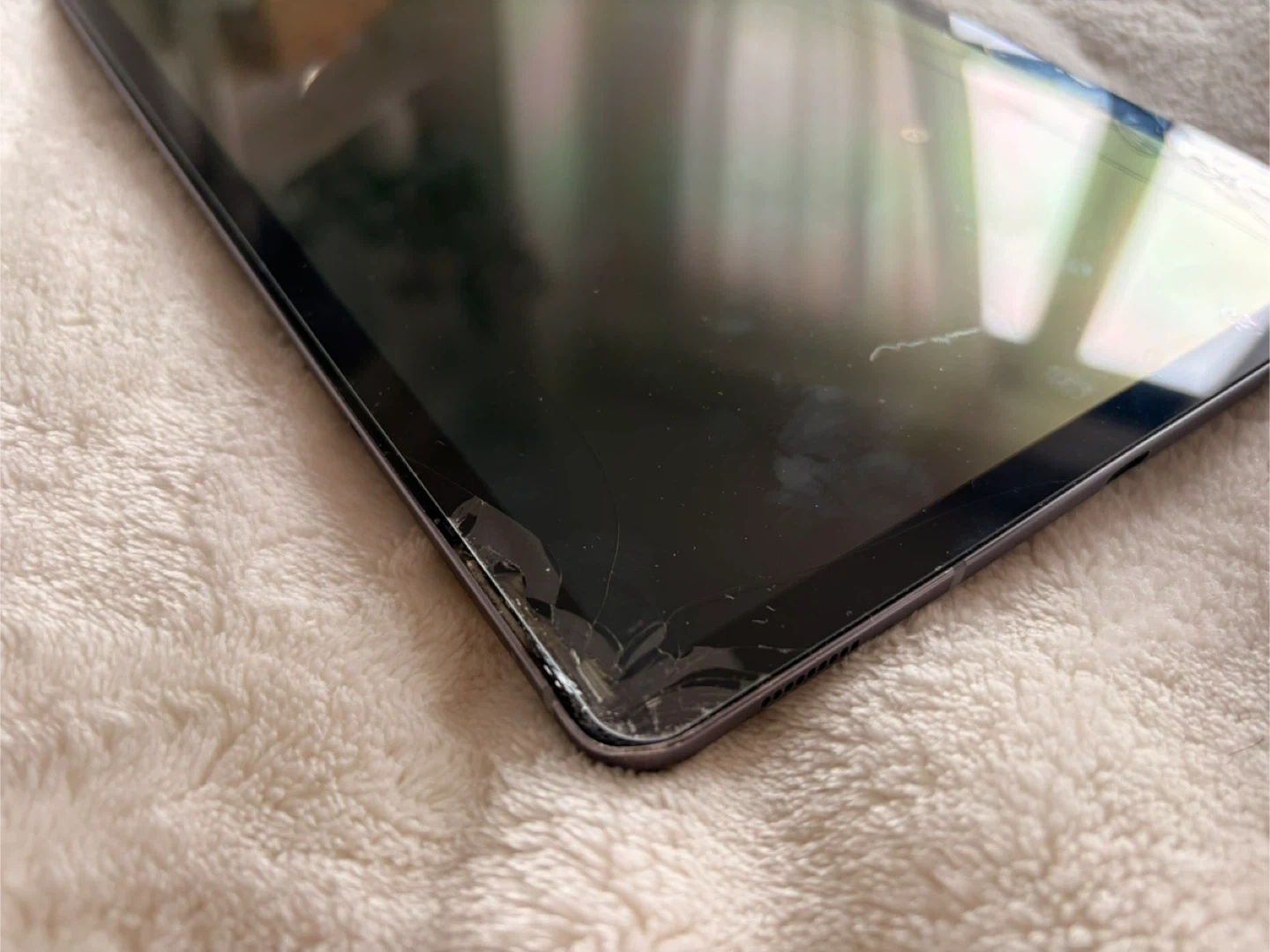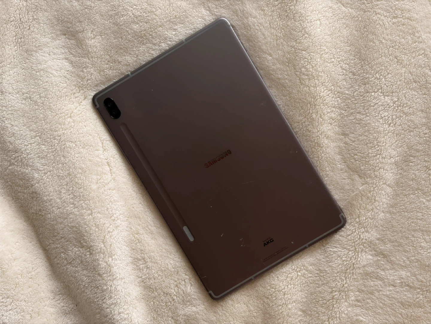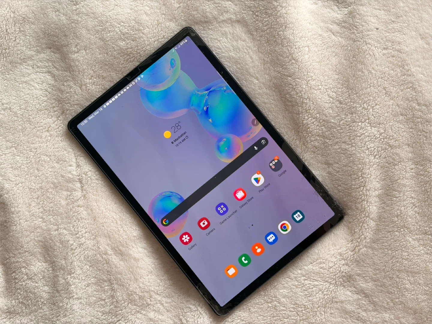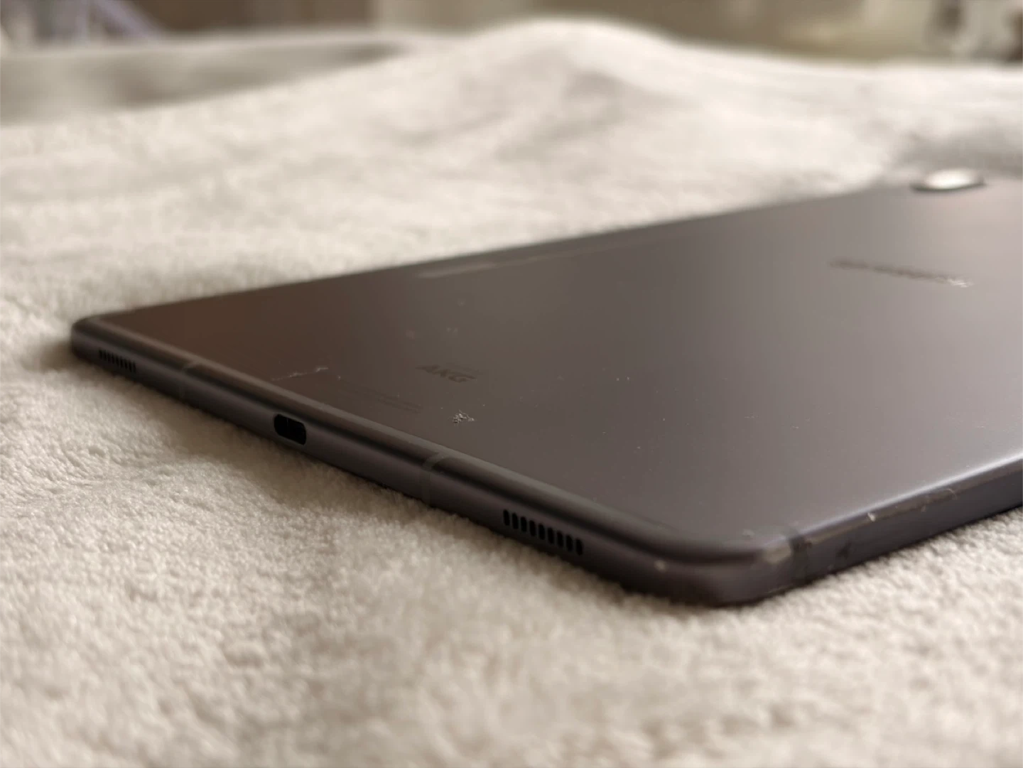 Samsung Galaxy Tab S6 tablet. It's dark grey and has a 10.5-inch display. There's some damage to corners of the screen and casing.