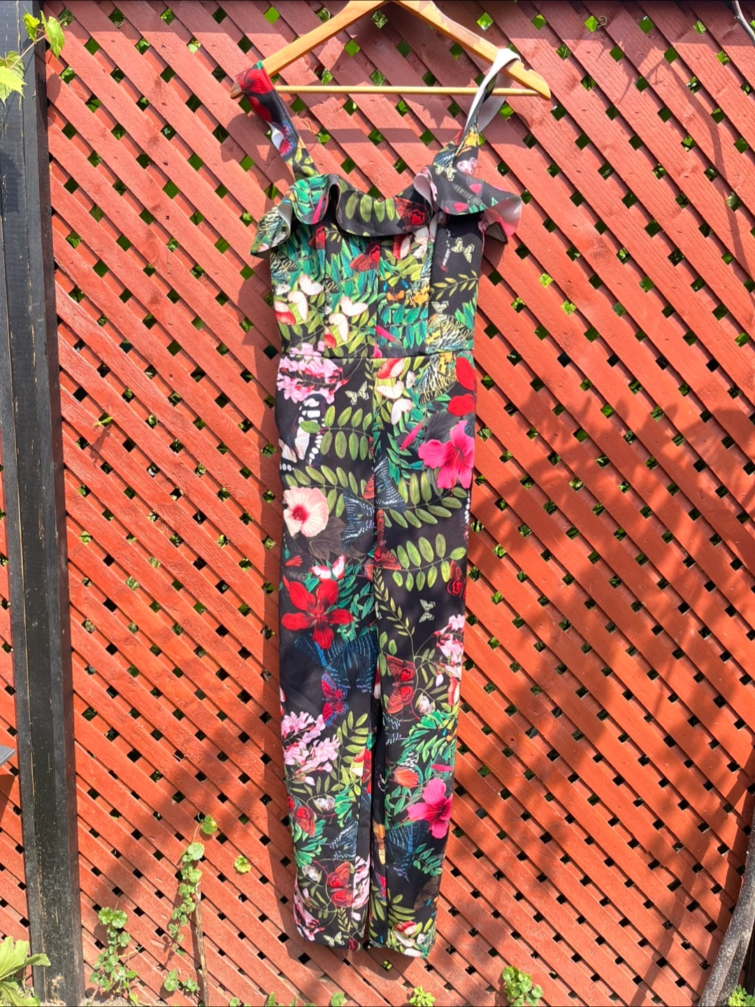 Selling a beautiful jumpsuit with a vibrant floral and butterfly print! It features a ruffled neckline and a fitted bodice that flows into wide legs. The material is lightweight and comfortable, perfect for spring or summer outings. It's in great condition and ready for a new home! Pick up only