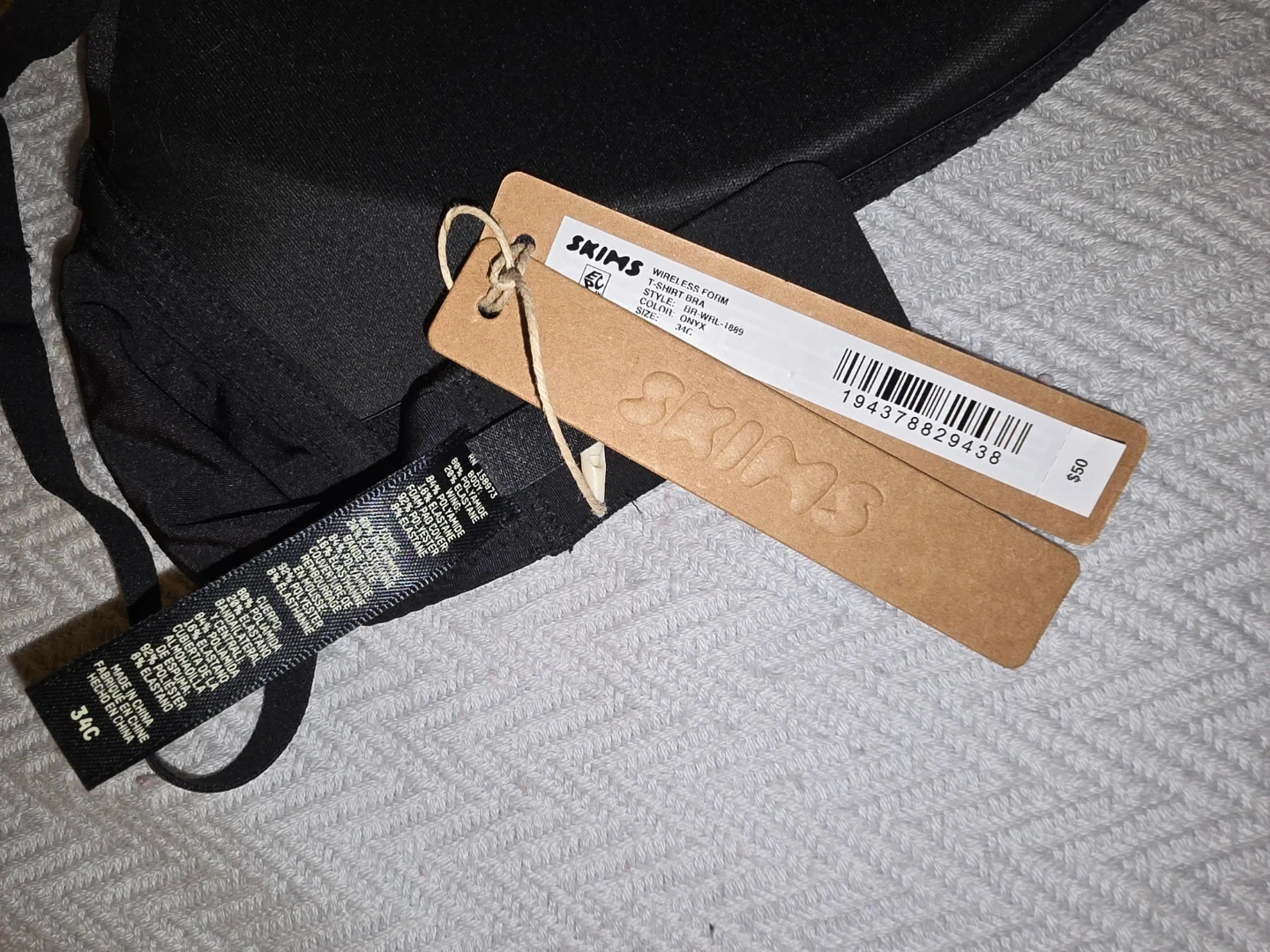 This SKIMS Wireless Form T-Shirt Bra comes in black and size 34C. It's made from a blend of nylon and elastane for comfort. This bra offers a smooth and supportive feel.