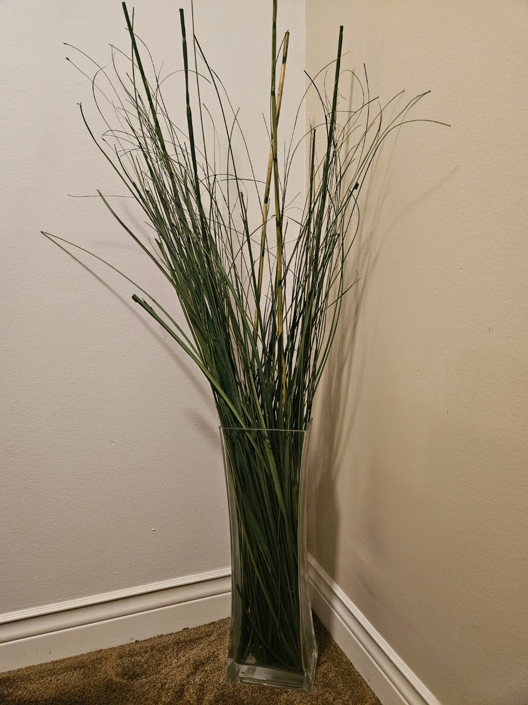 Add a touch of natural elegance to your space with this tall decorative grass arrangement! It comes in a clear glass vase and is perfect for adding height and texture to any room. The grass is a mix of green and brown shades, creating a realistic and calming effect. 45 inches high with the grass sticks included.