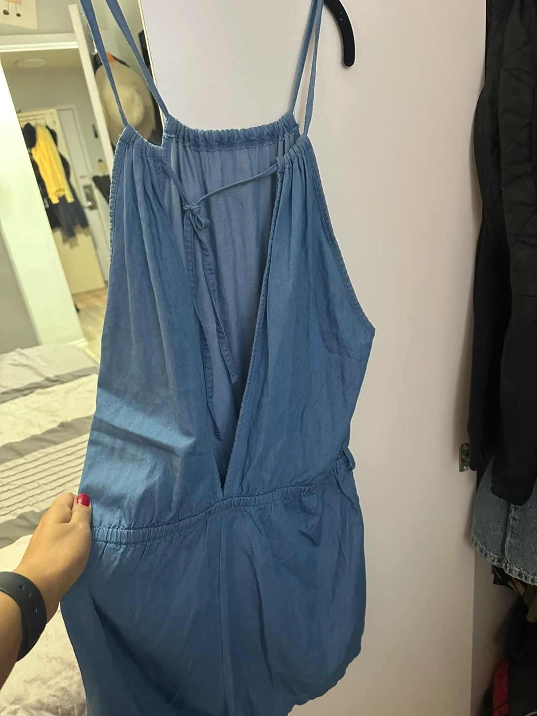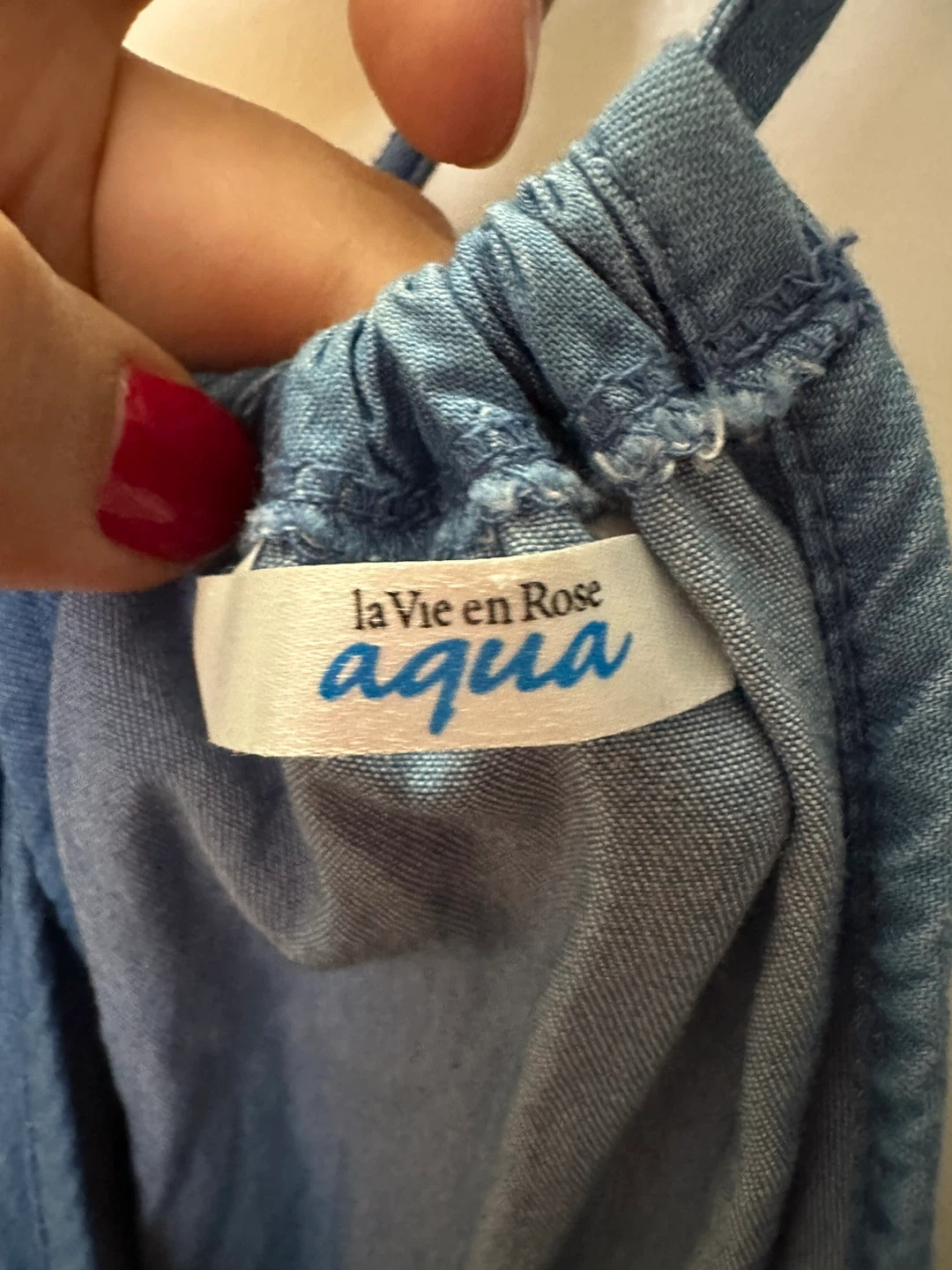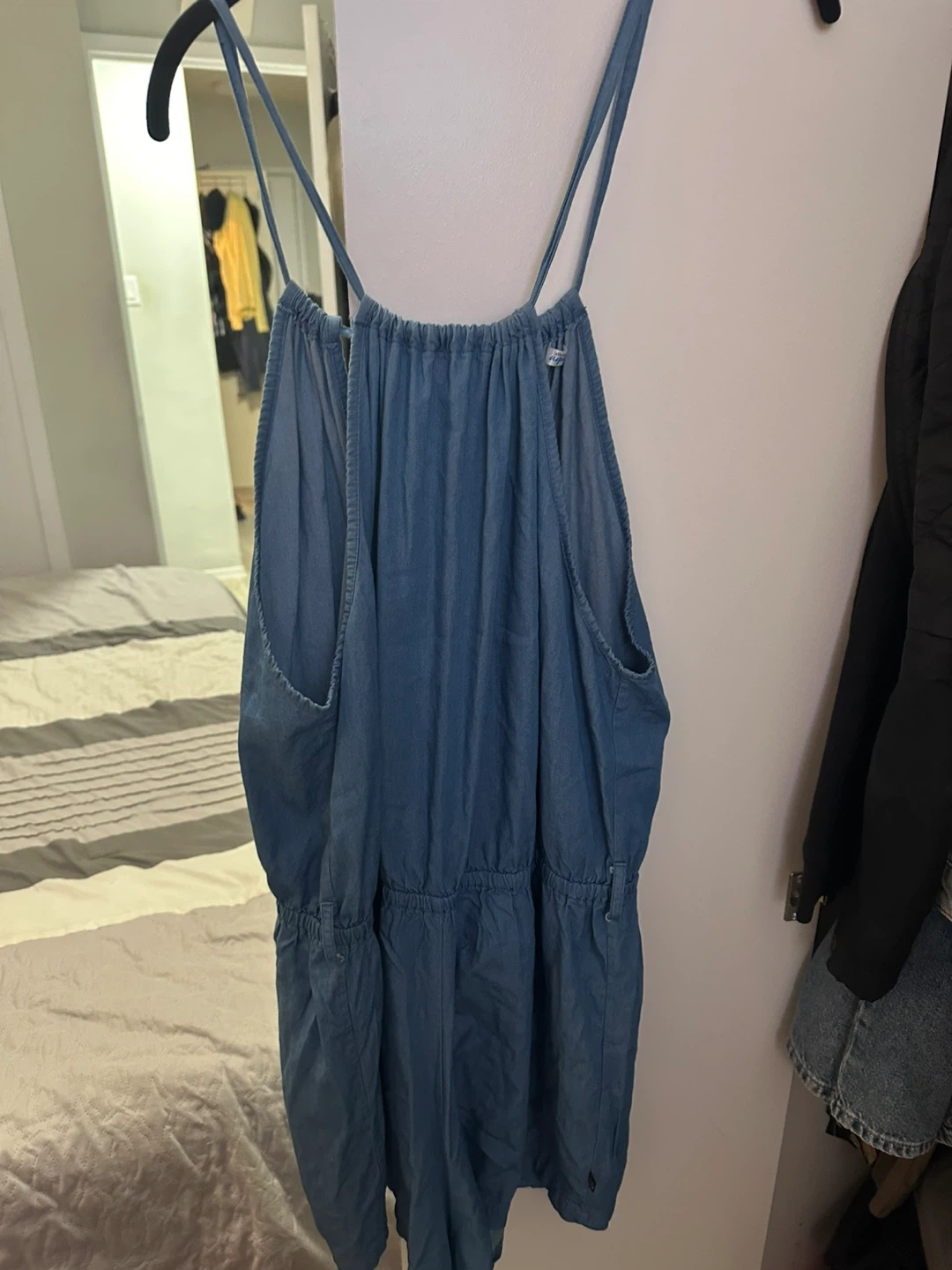 This La Vie en Rose Aqua romper is a stylish blue denim piece. It features adjustable spaghetti straps and a cinched waist for a flattering fit. Great for casual wear on warm days! Pay by cash please