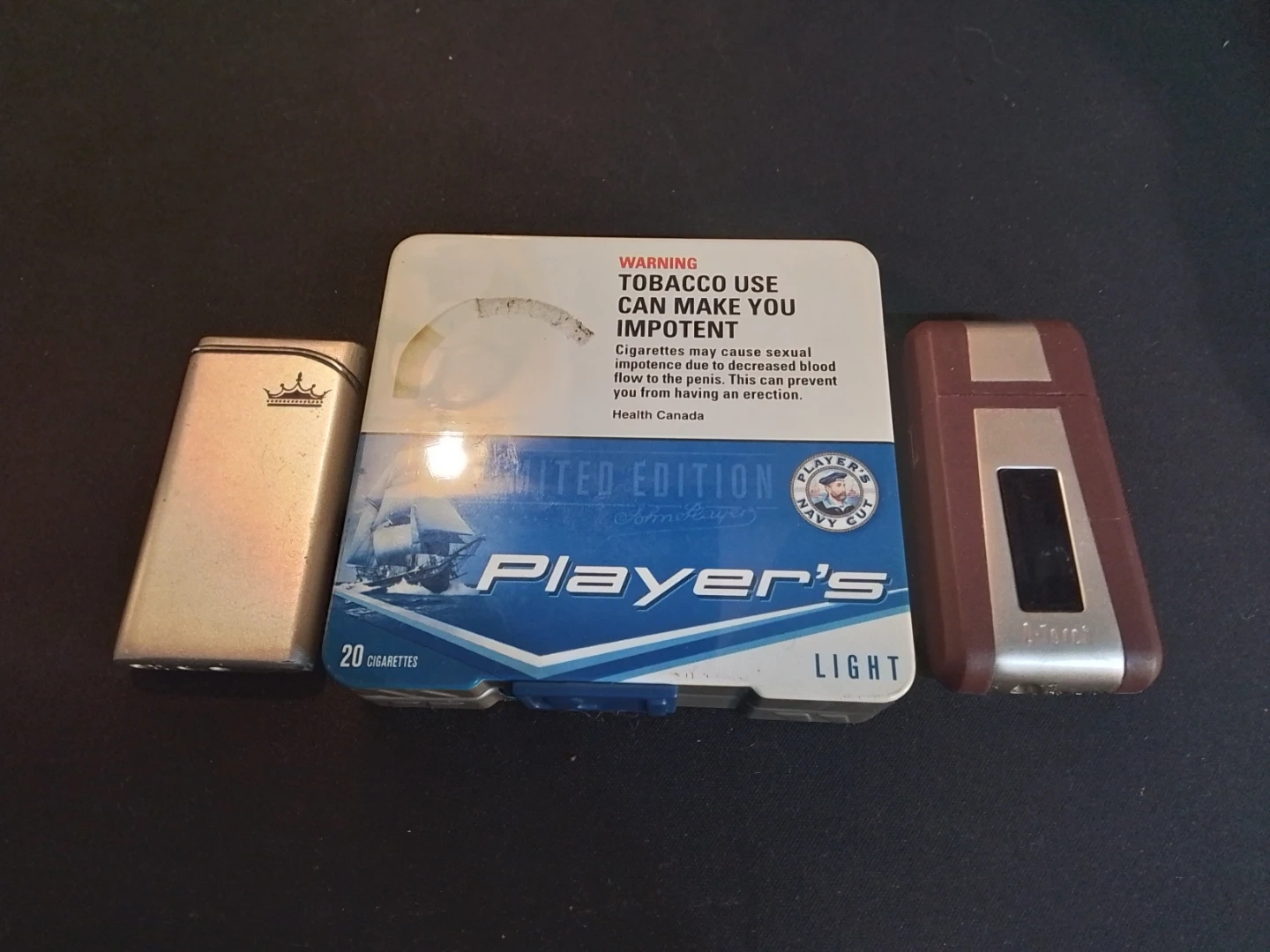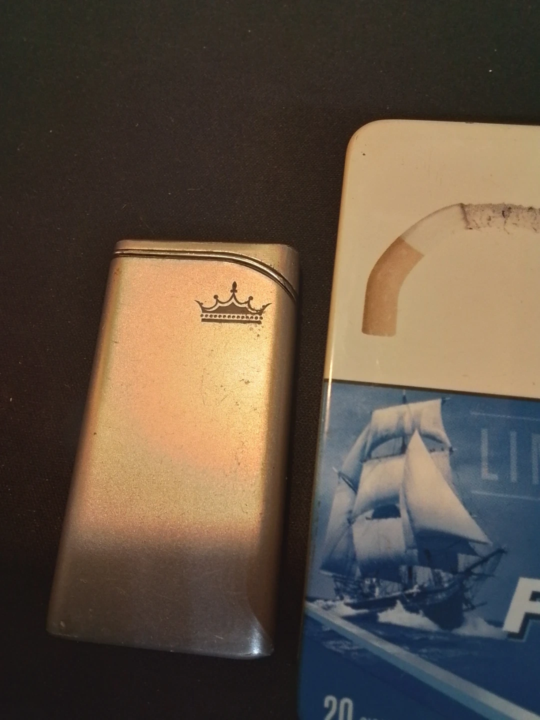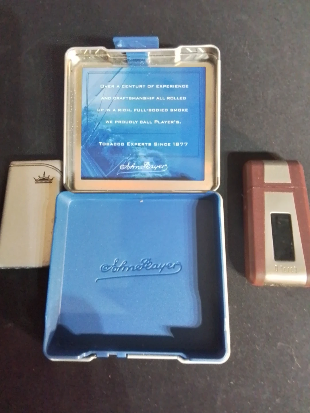 This is a Player's Light cigarette case that holds 20 cigarettes. It comes with a vintage silver-toned lighter and a Q-Torch lighter. The Player's case features a ship design.