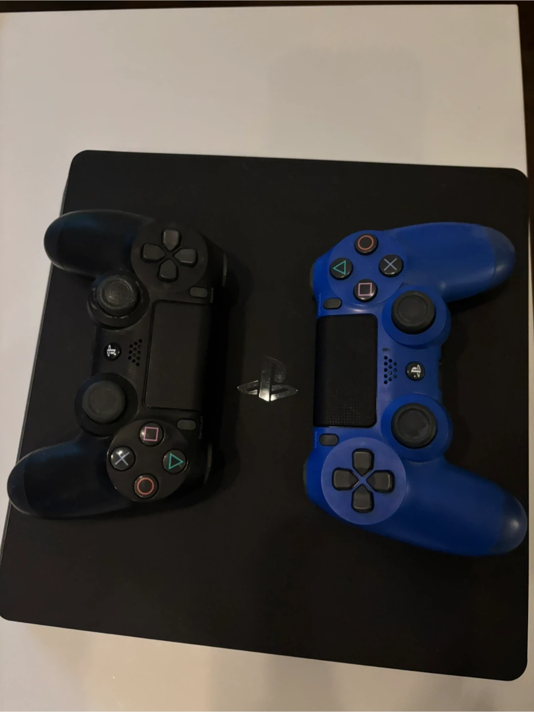 Selling two DualShock 4 wireless controllers, one in black and one in blue. They're in good working condition. Includes analog sticks and D-pad for gaming. Great for couch co-op sessions!