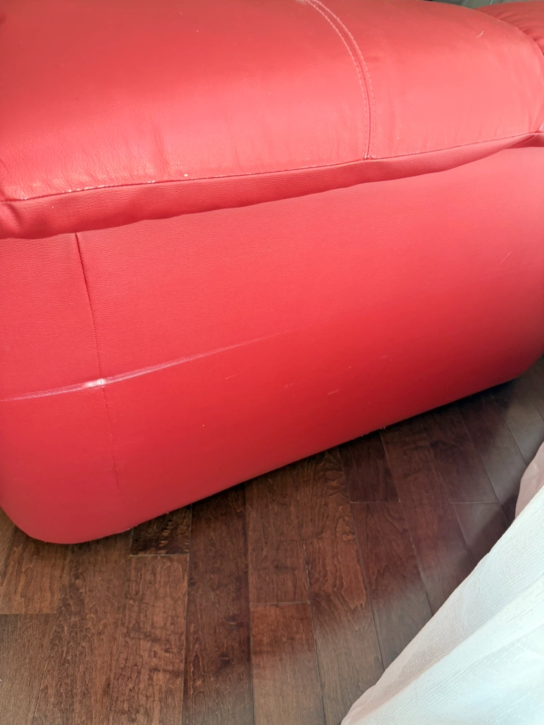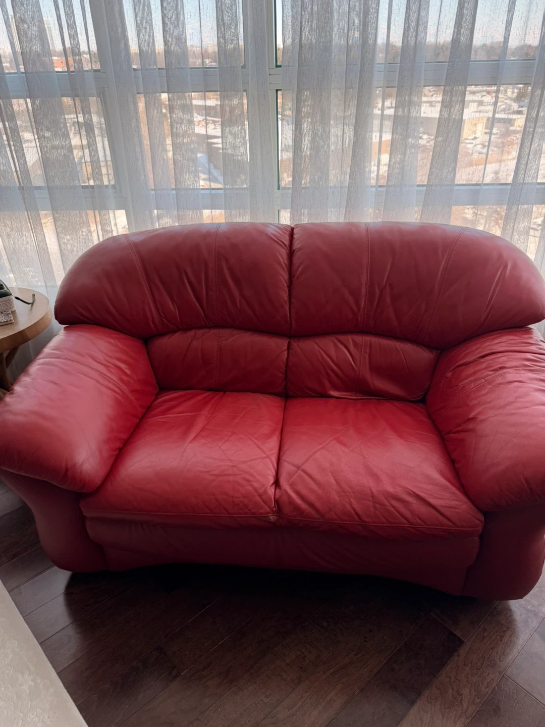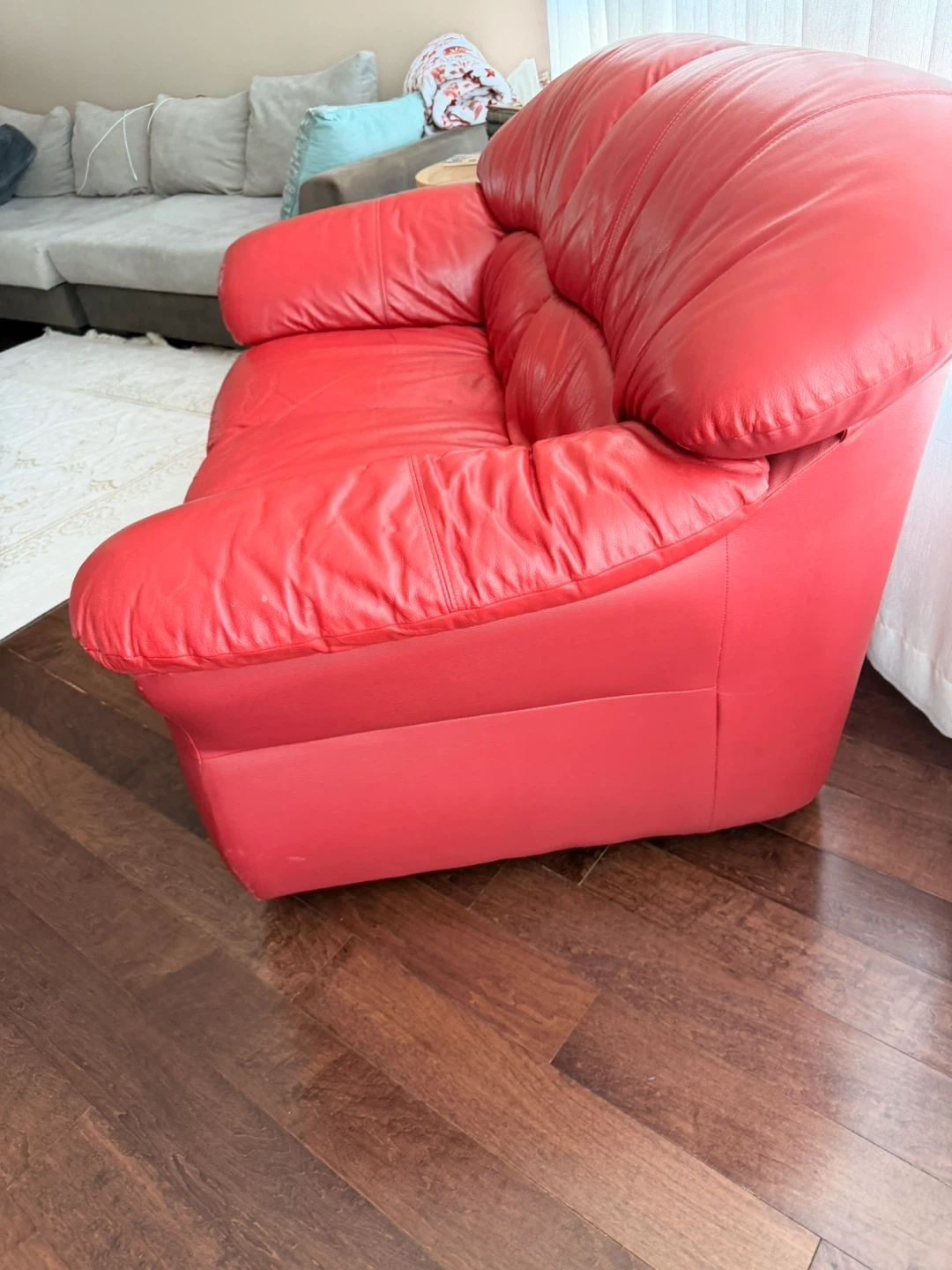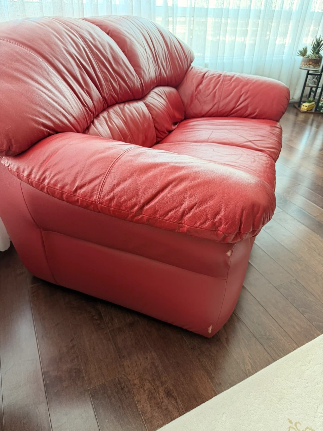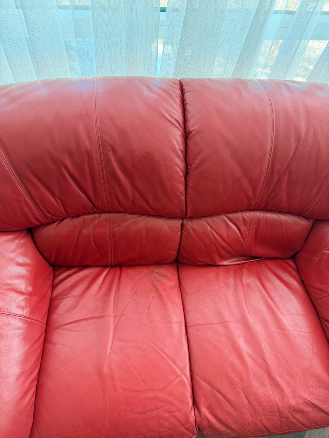 Selling a red leather loveseat sofa. It shows some signs of wear, like scratches on the side and some marks on the seating area. Still a comfy and stylish piece!