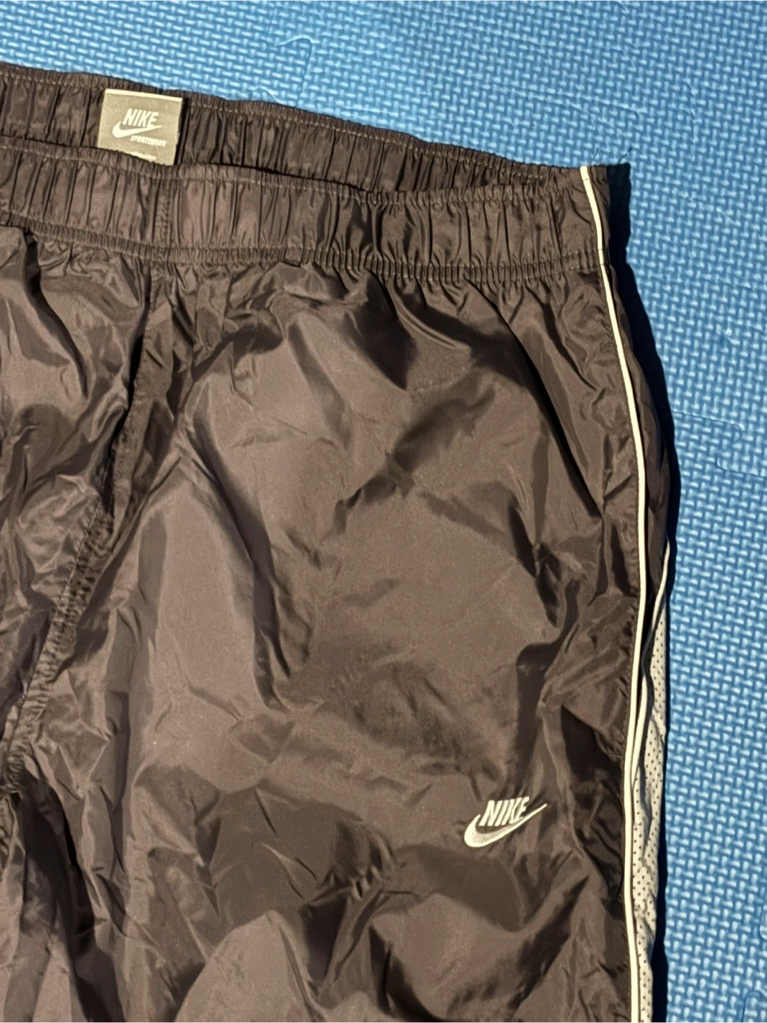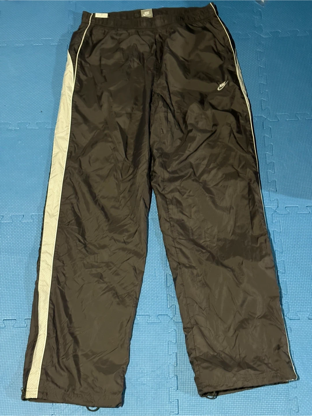 Black Nike track pants with a white stripe down the side. They're made of a lightweight material and feature an elastic waistband with a drawstring. Perfect for athletic activities or casual wear!