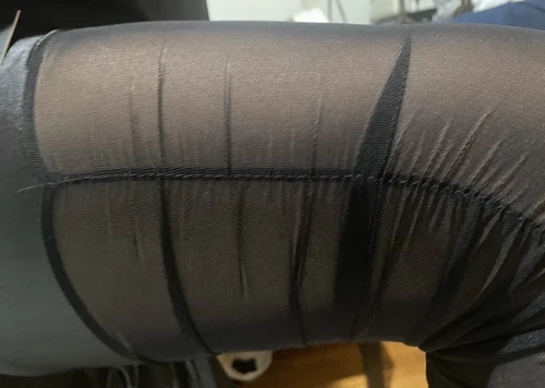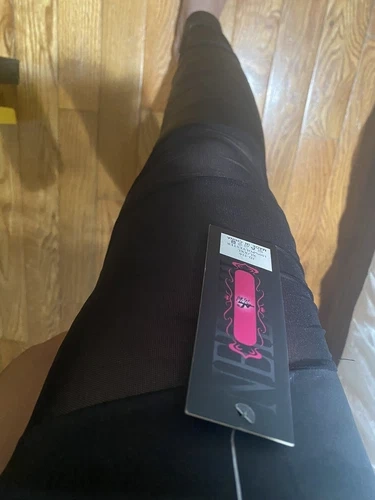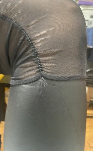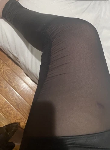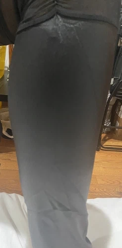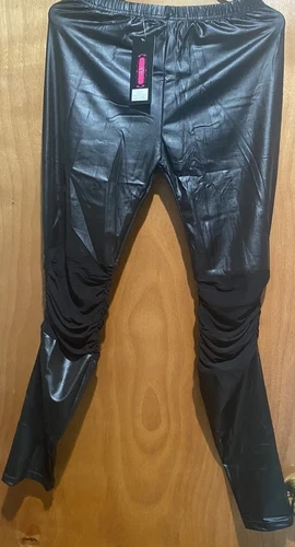Shiny black leather-look pants from NEILIXIL. Features transparency on both legs and a comfortable spring waist. Size XL/XXL.